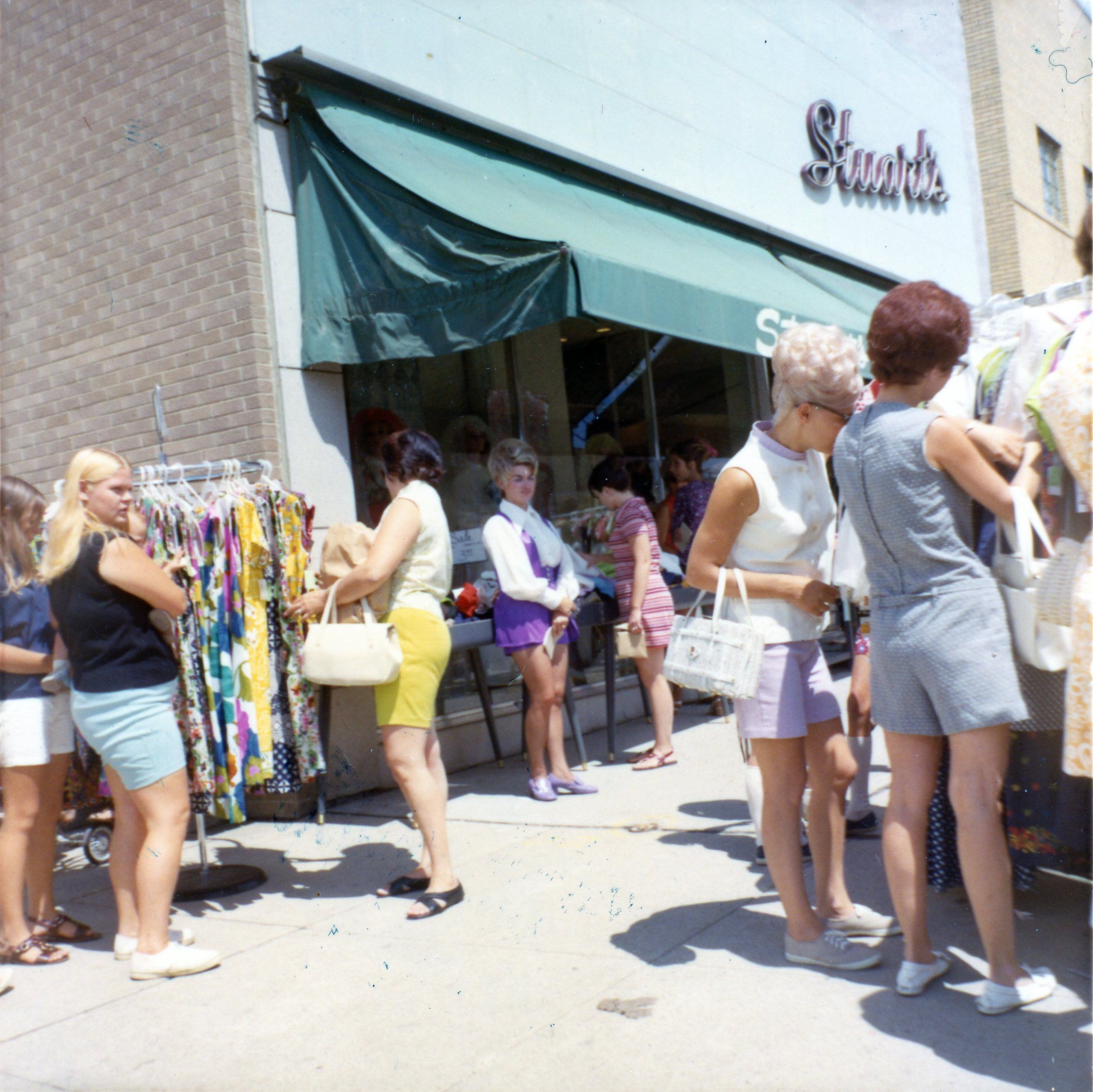 Sidewalk Sales Summer Festival 1971. Stuarts dress shop, Michigan Avenue