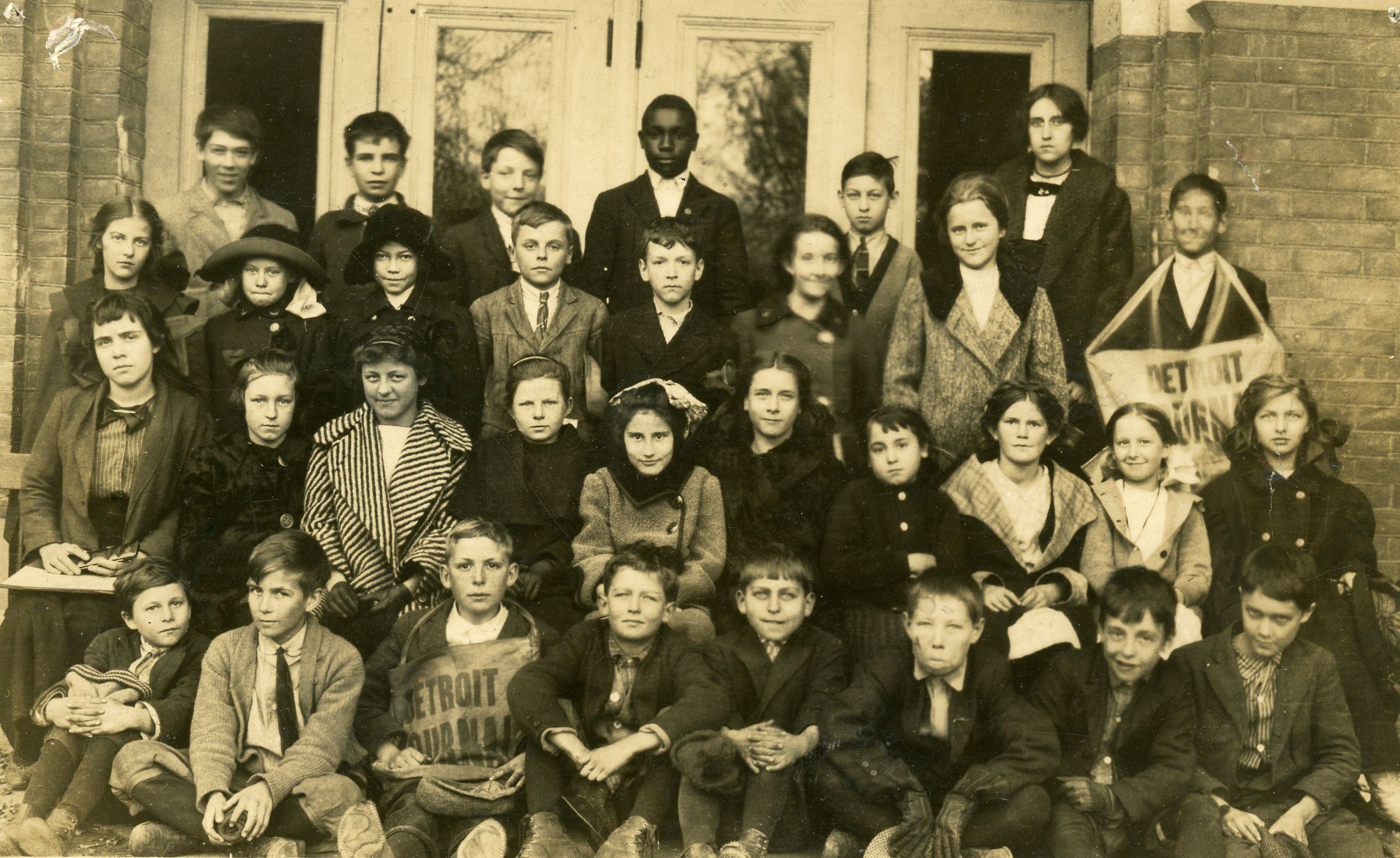 Wayne Class 1910-1920 with Sidney Cross as the teacher. Top Row L to R: ?,?, Donald Francisco, ?,? and Sidney Cross. 2nd Row from back L to R: Lucille Boomer, Jake Shambers, Dean, ?, Claude Carpenter, ?, Luise Porter and ?. 3rd Row from Back: Nancy Greman, Lenore Billings, Janice Austin Scott, Evelyn Austin Truesdall, Alice Murphy, Dorothy, V Fuller, Schawleers, Bernice Lohr and Mary Mathis. Front Row L to R: Lewelyn, Wesley Whitney, Anthony Drager, Russell Parr, Edward Dettmar, Ray MacIntyre, Joe Murphy and ?.Cataloged By