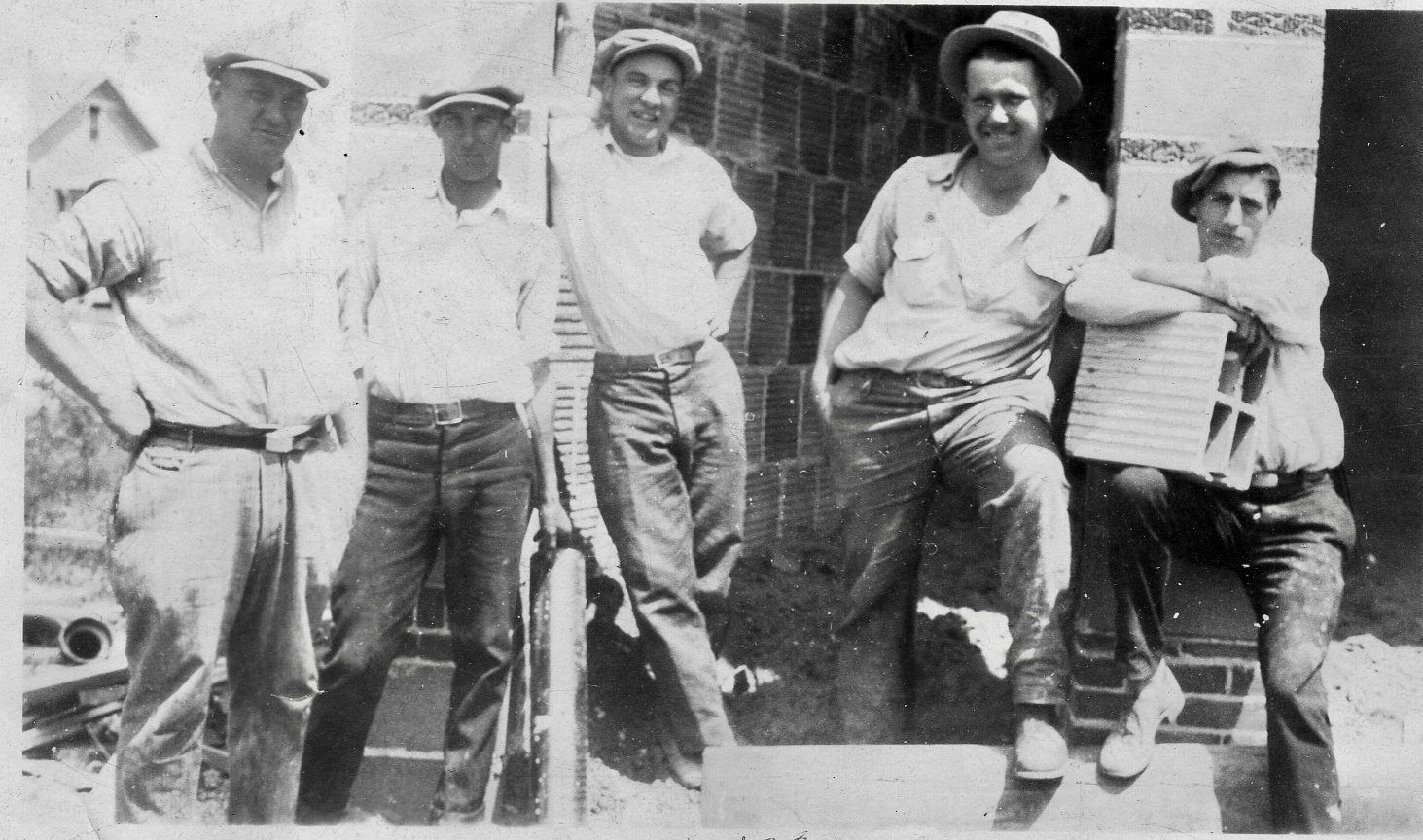 Workers on site laying bricks for theater, 1927