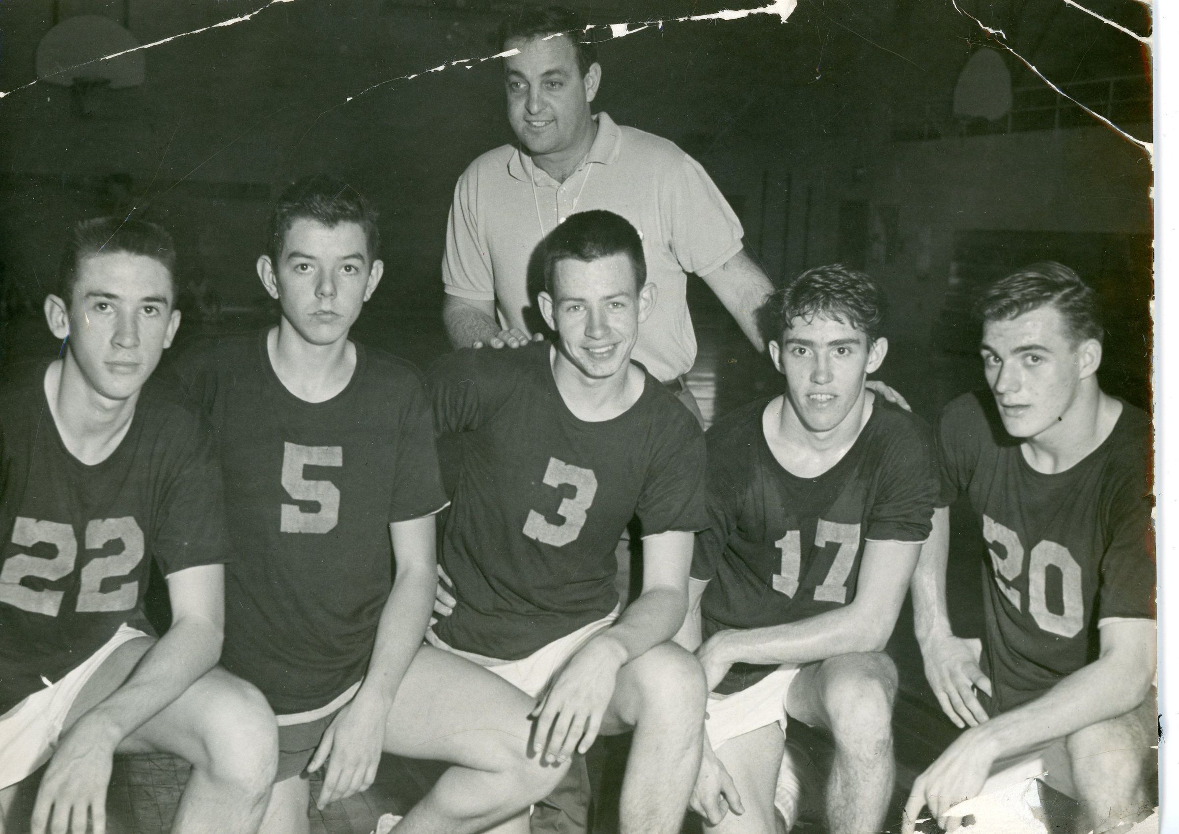 Wayne High Basketball Team in December of 1959. In the center in back is Coach Deno Deluca. From L to R: Mike Govin #22, Corky Hayes #5, Jim Peterson #3, Ron Gray #17 and Frank Burton #20.Cataloged By