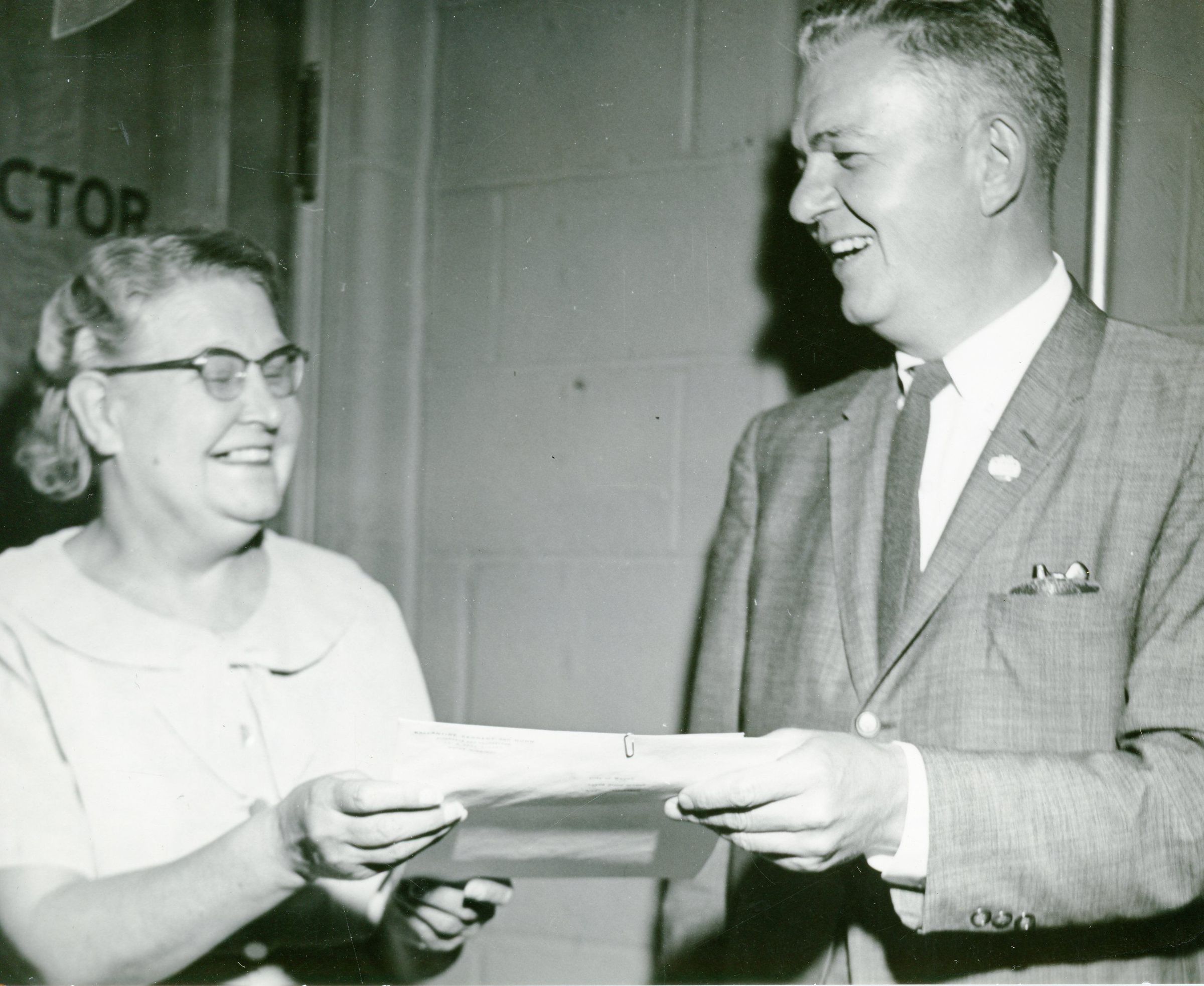 Miss Ida Doletzky receiving a check from Mr. Balentine for the Historical Society.