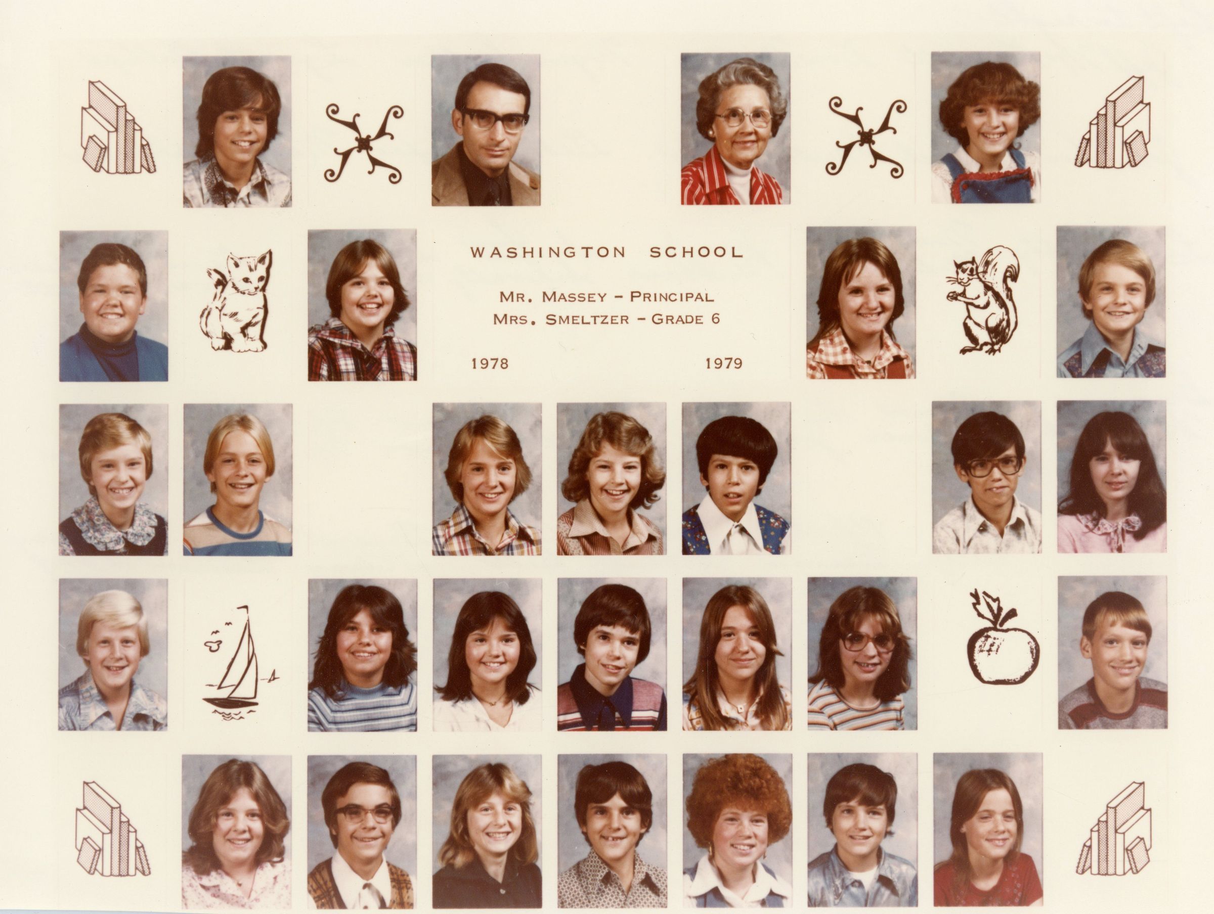 Washington School 6th grade 1978-79 (L_R) Jeff McDermott, Mr. Don Massey (Principal), Myrna Smeltzer (Teacher), Lynette Phillips. John Swindlehurst, Martha Miller, Debbie Snipes, Matt Kukhonen. Lisa Shelly, Mark Middlin, Jennifer Hubbard, Susan Schwartz, Scott Trapp, David Sova, Michelle Bennett. Greg Whitworth, Dawn Glover, Lisa Johnston, Doug Willett, Donna Harrison, Elizabeth Martin, Roger Green. Edie Kurtz, Phillip Bliven, Yvonne Hillier, David Bell, Bridget D'Arcy, Mike Bowman, Sherry Long.Cataloged By
