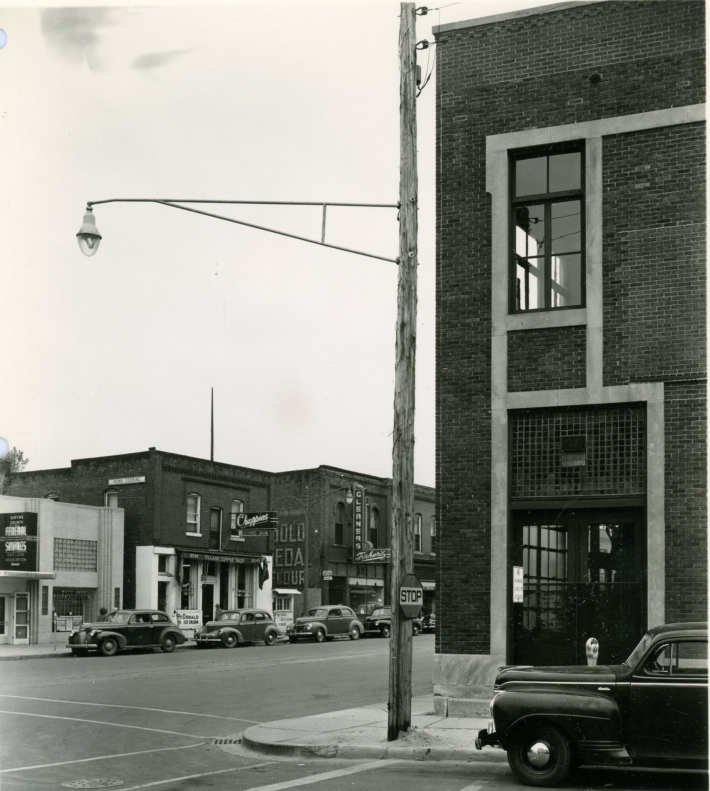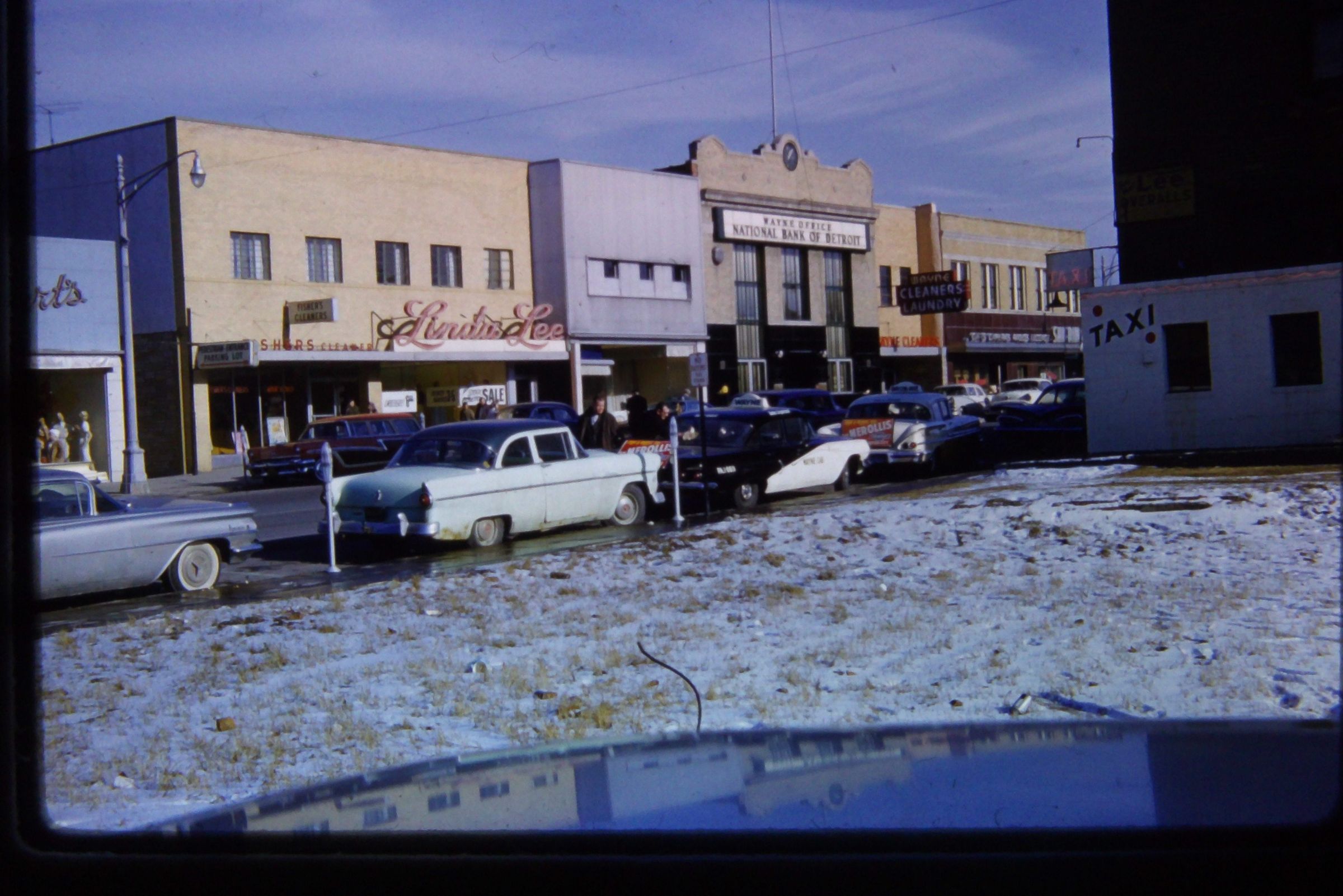 SE corner Michigan and Biddle. 1948. Federal Savings, Chappies, Fishers Cleaners, Wayne Dress Shop, Bank block. Photo showing new light poles installed 10-5-1948.Cataloged By