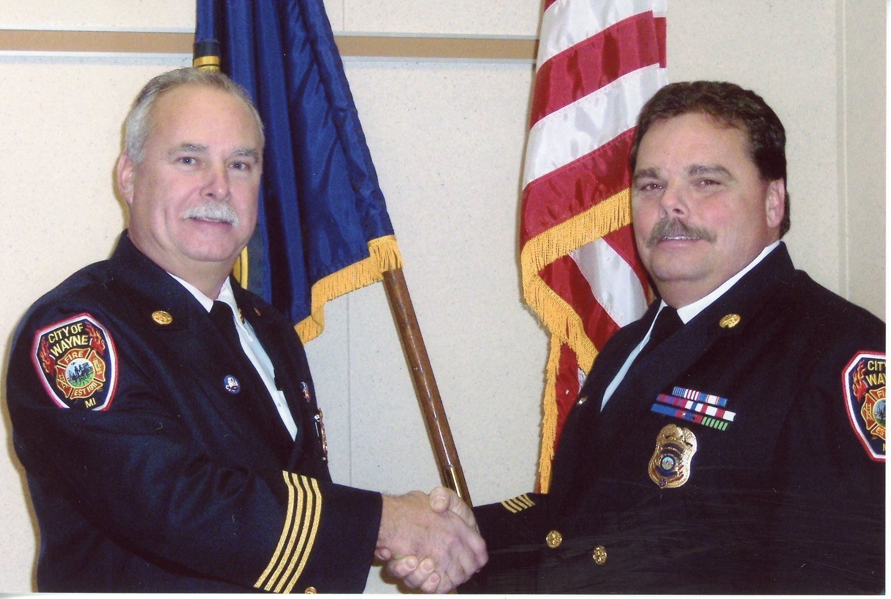 Deputy Chief mike Mckee shaking hands with Chief Mel Moore in 2008.