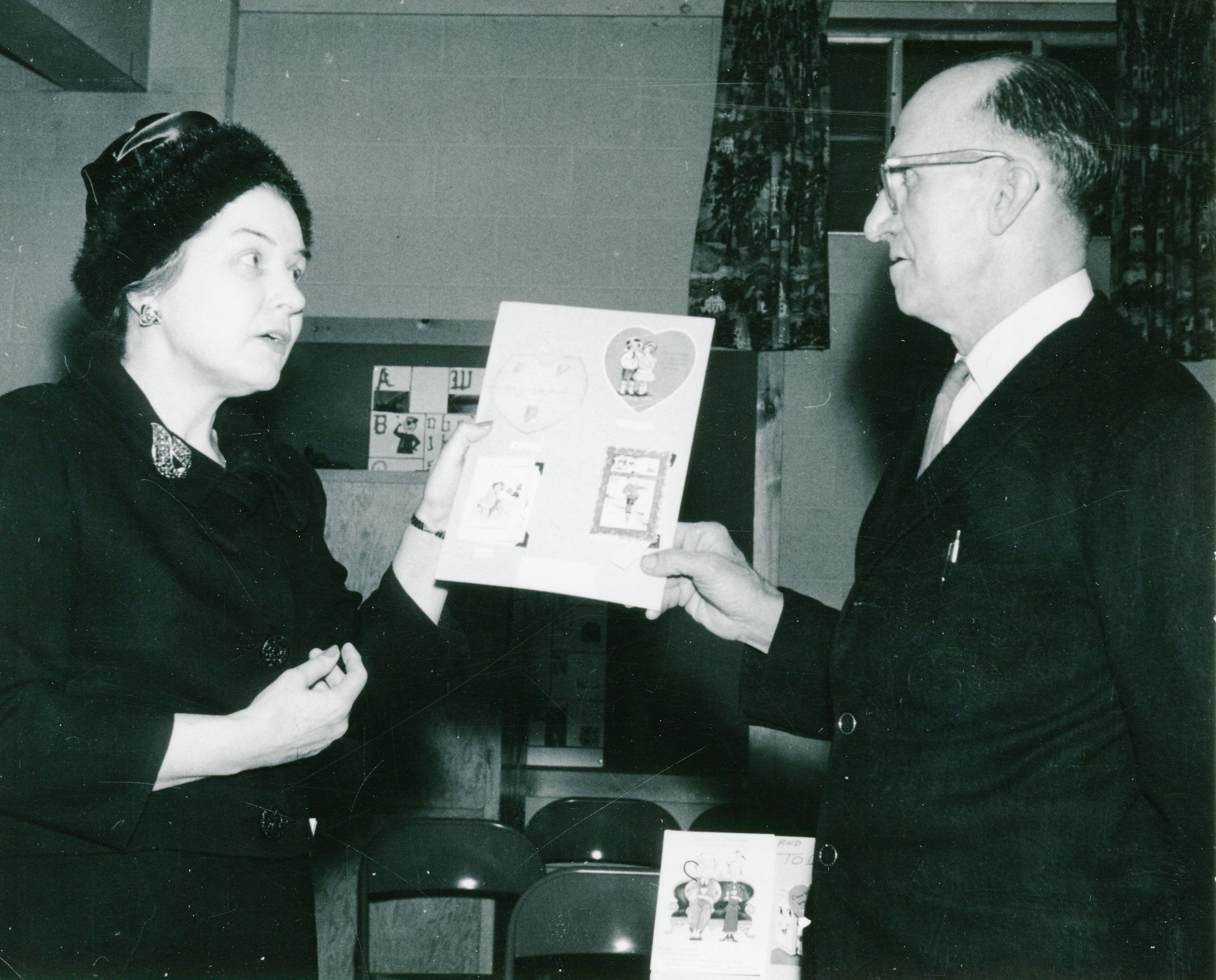 Mildred Hanchett and John Macfie talking about valentines on Feb. 20, 1963.