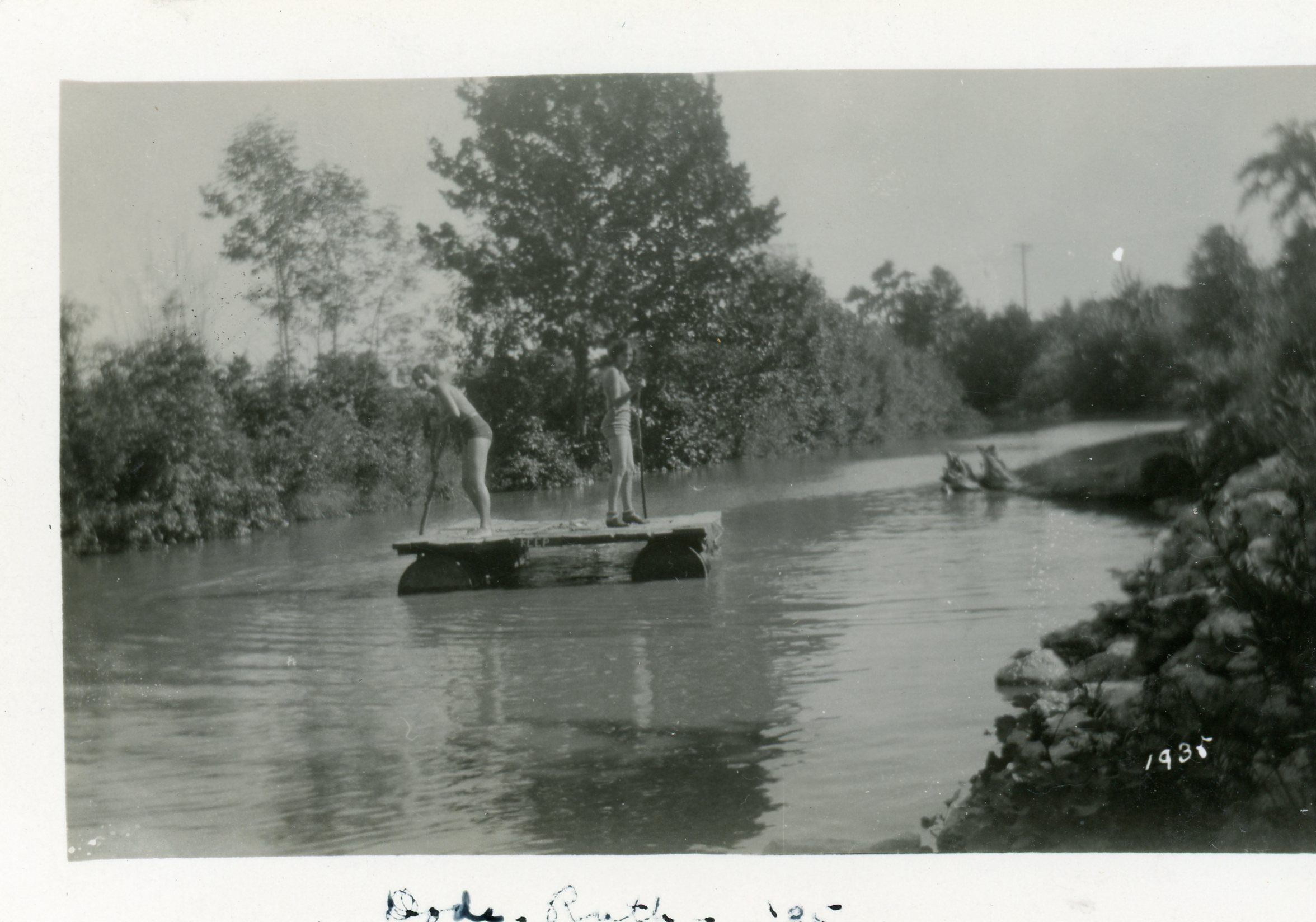 Raft on the Rouge 1935. Ruth (Wilkinson) Hawley and Dorothy (Wilkinson) Ballantine on raft in Rouge River near Clark St.