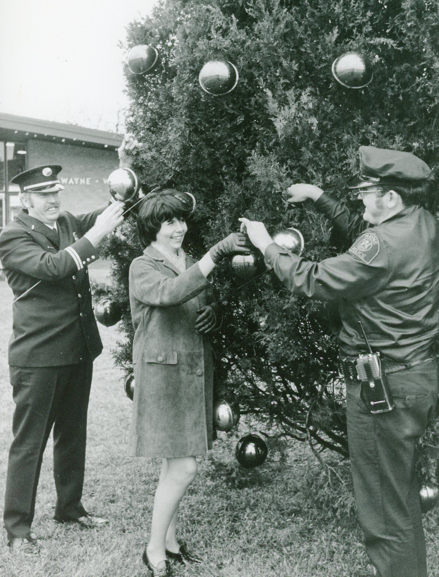Wayne Police Officers George Ferguson and John Colligan decorating the City Hall for the Holidays on Nov 29, 1973. Photo taken by Lothar E. Konietzko for the "Eagle". Taken in front of the Wayne Westland Library.Cataloged By