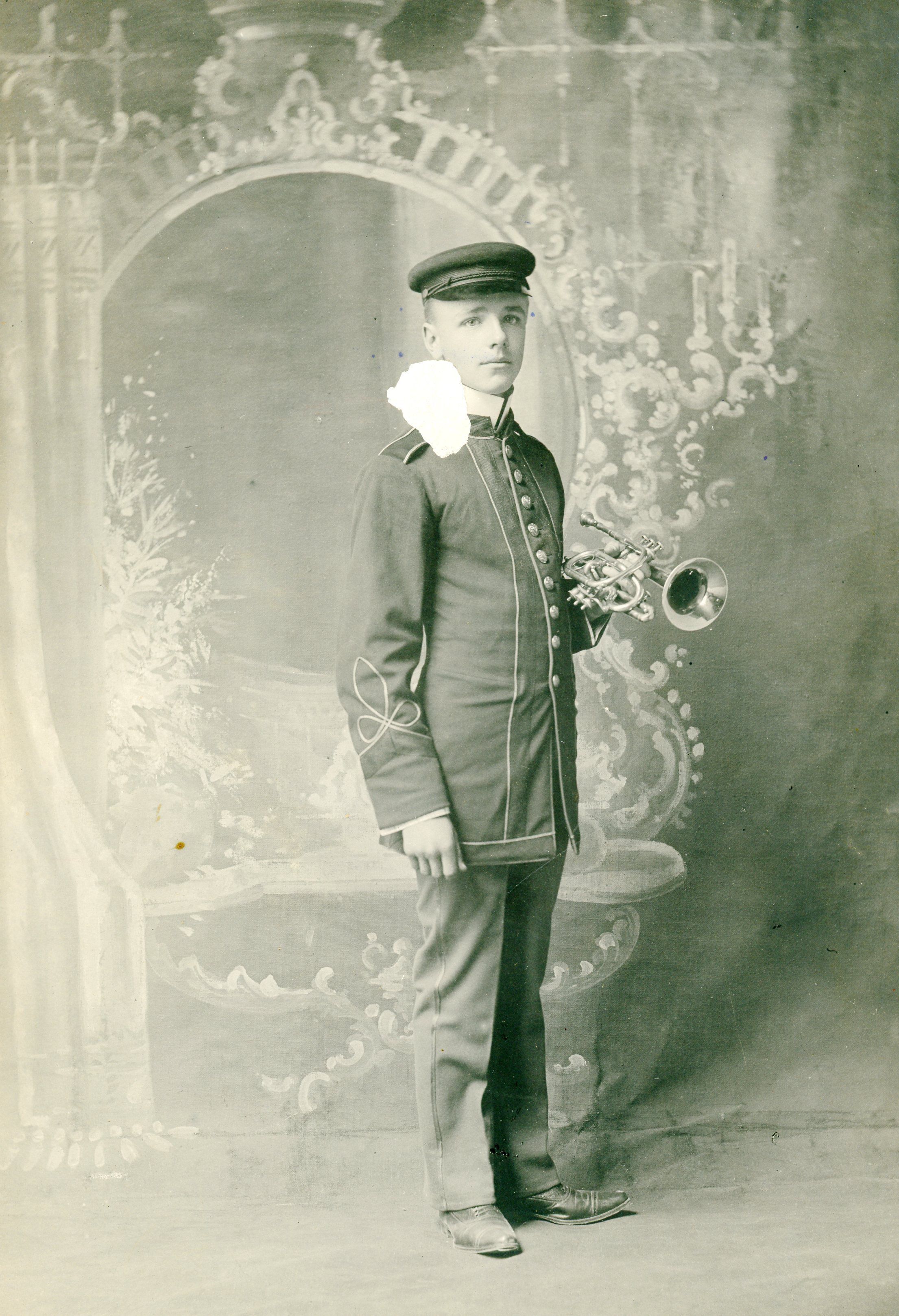 Samuel Bradshaw Cady in his band suit "Boys Wayne Band" about 1895