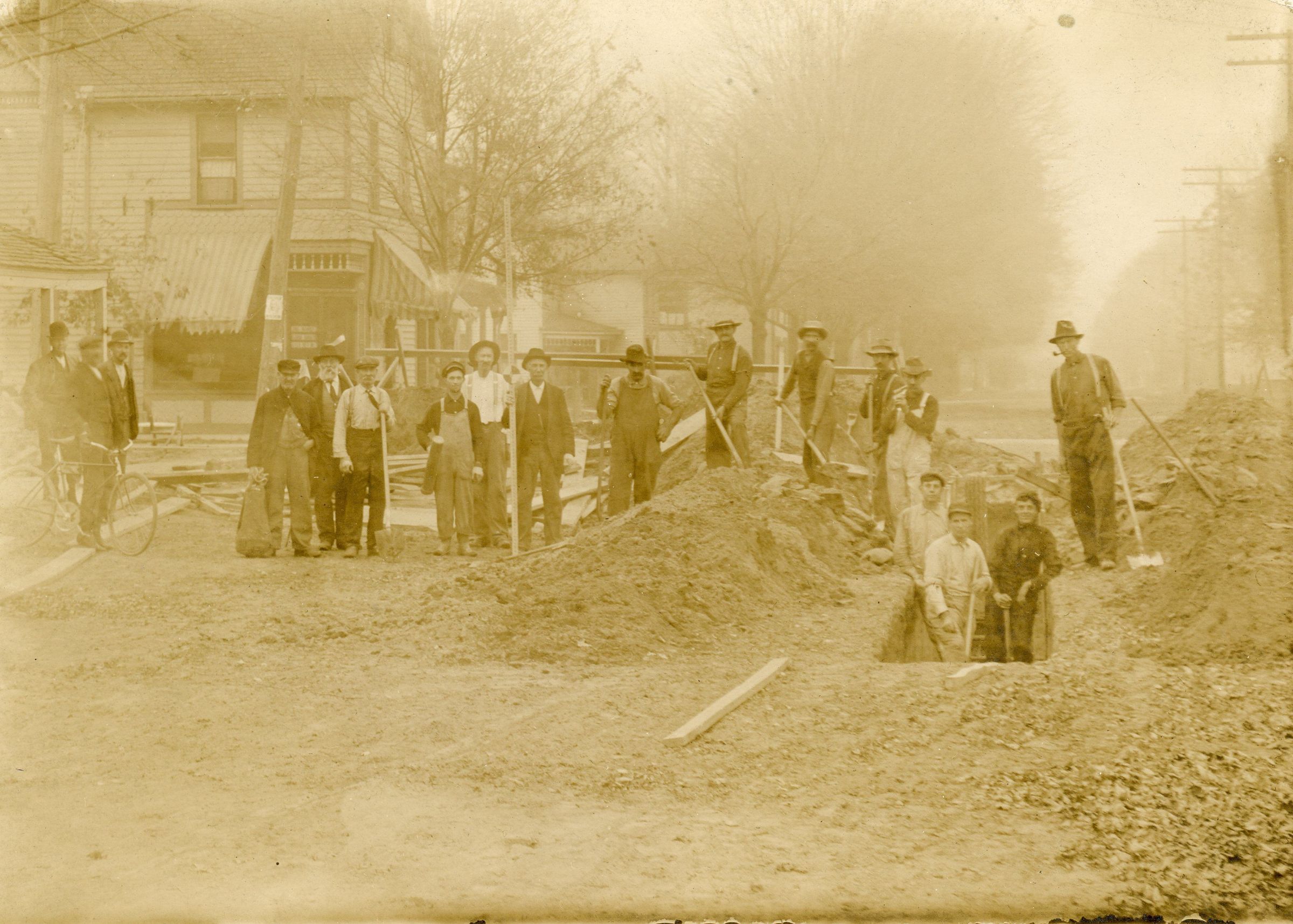 Newberry at Brush Street looking North. 3950 Newberry in background, Francisco Meat Market. 1914, likely installing the first water mains.