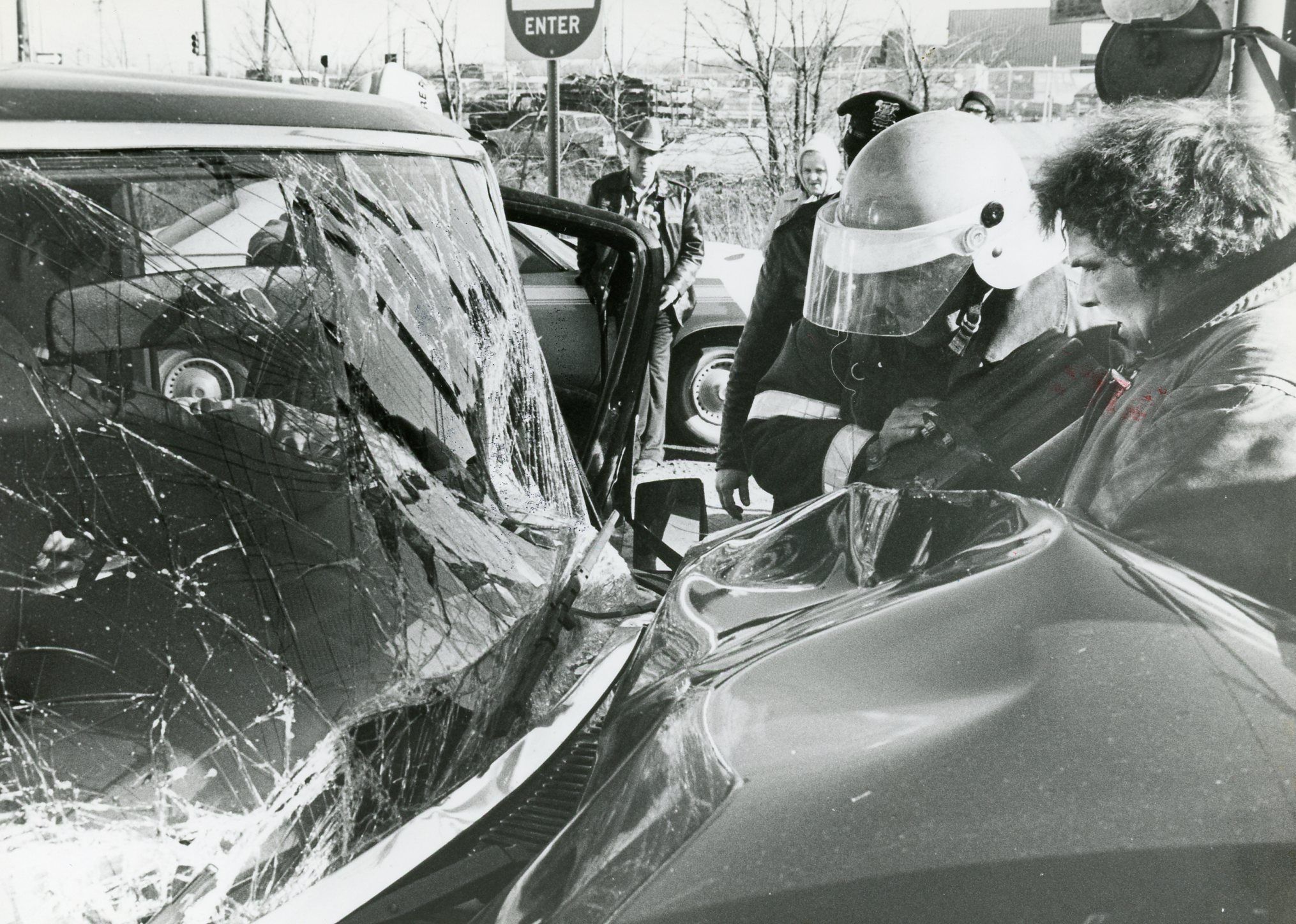 Lt Turner and Art Palo with "Jaws of Life" to take a door off. Mar 12, 1981. Photo by Lothar E. Konietzko