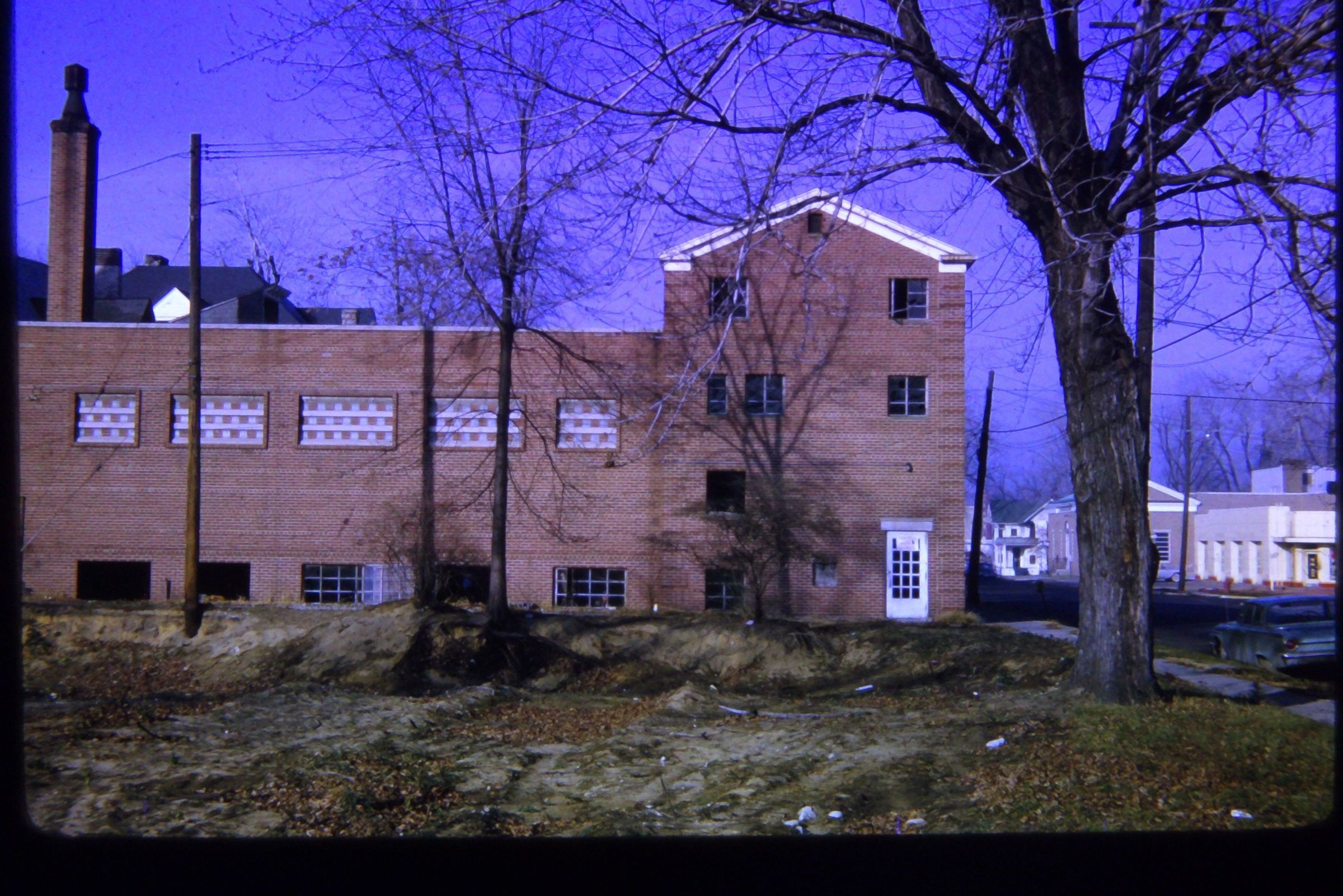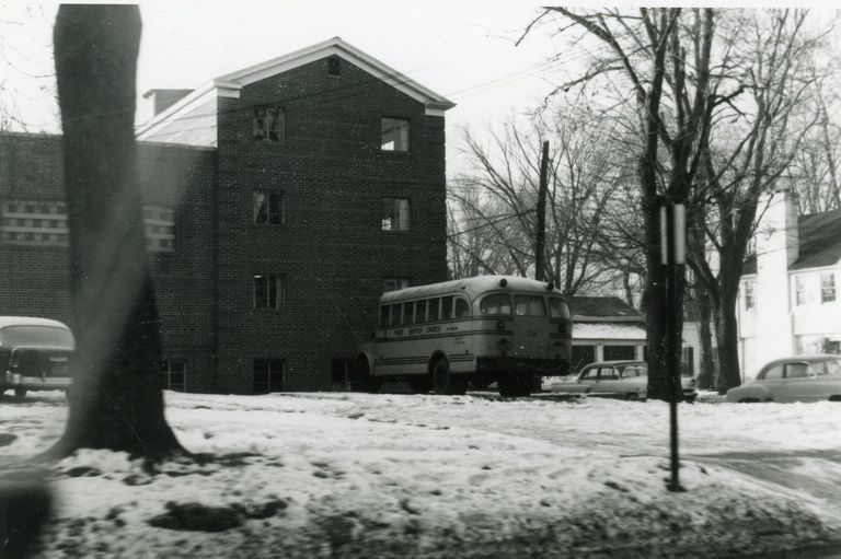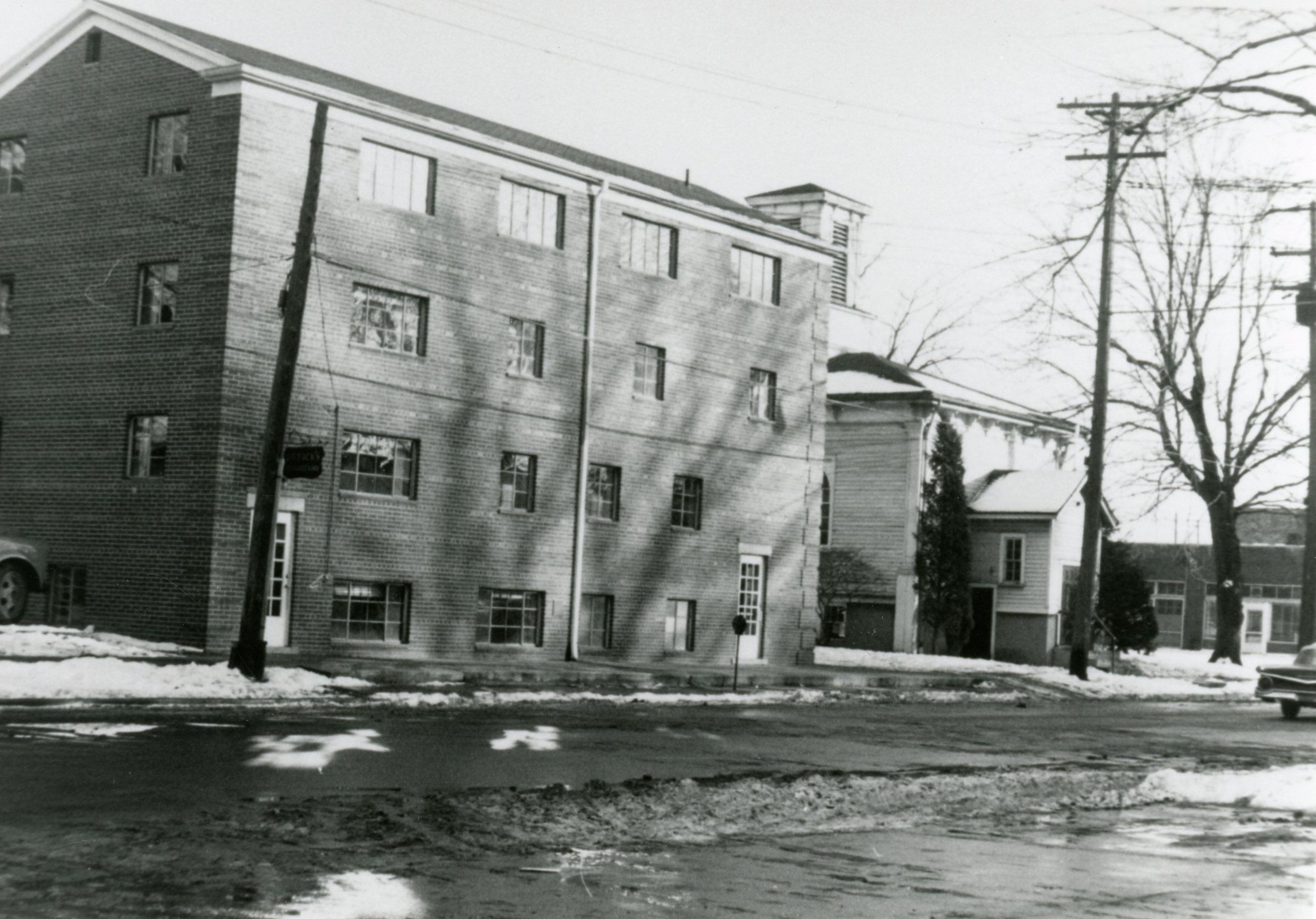 Apartments and St. Johns Episcopal Church, 3831 Newberry Street. Corner of Main and Newberry, St. Johns Episcopal Church on right behind apartments. Apartments built after 1950. Torn down for Urban Renewal.Cataloged By