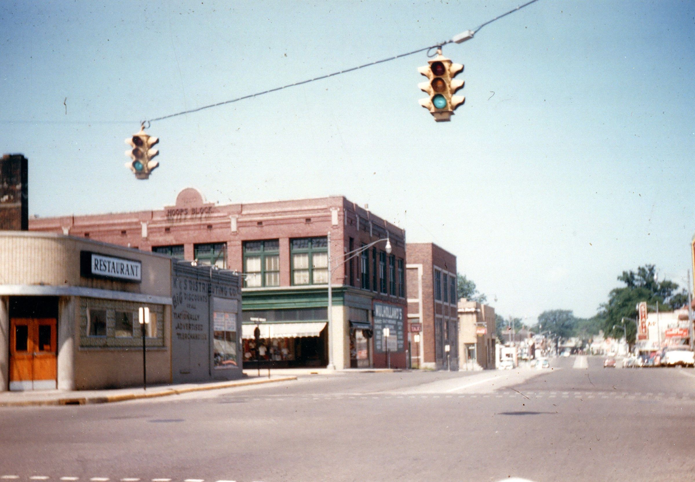 SW corner Michigan and Wayne road. South side of Michigan. 1957. Monroe street on left side in front of Hoops Block. All torn down for Urban Renewal.Cataloged By