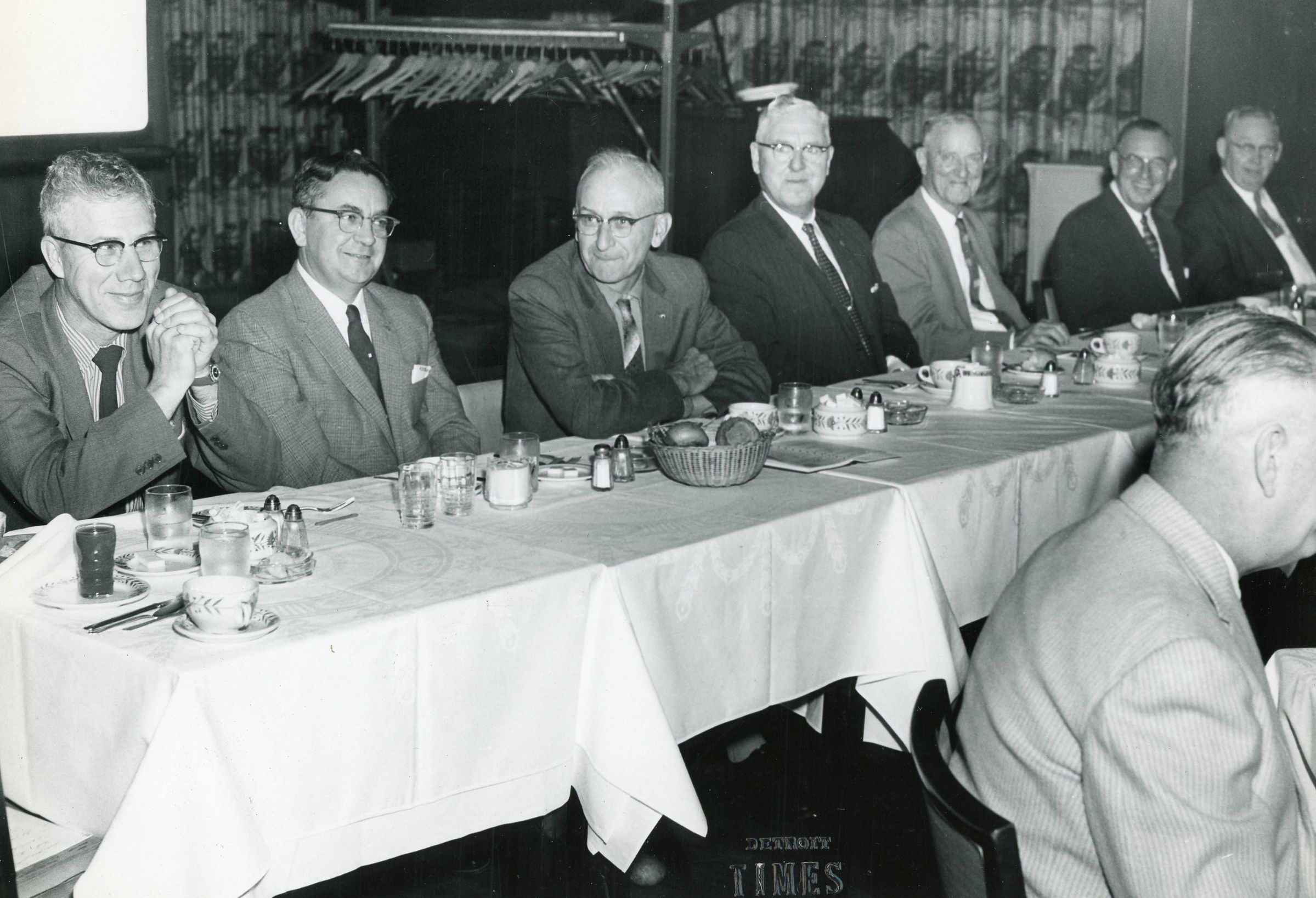 SE Michigan Fire Chiefs Meeting 1958 at Hucks. (L-R) Goudy of Wayne, Bill Mason of Grosse Pointe Farms, Heller of Ann Arbor, Hught Fisher of Lansing, Jack o'Keefth of Detroit, W. Ray of Gas Co., Ed Blohm of DetroitCataloged By