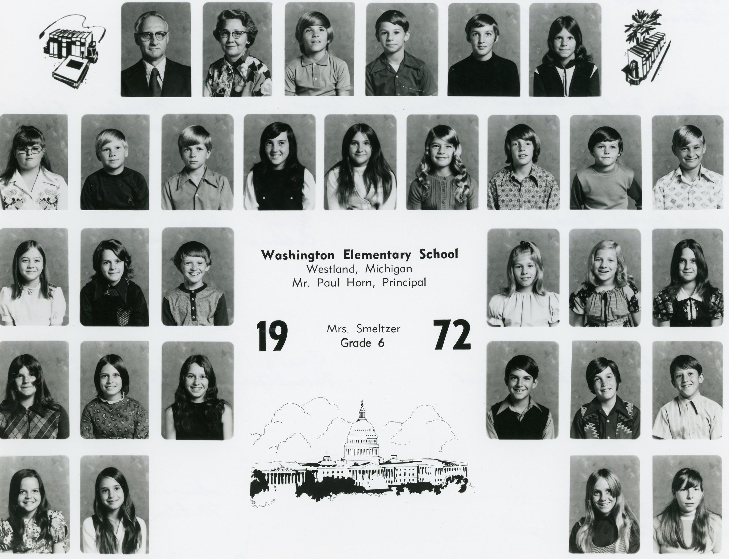 Washington School 6th grade 1972. (L_R) Mr Paul Horn (Principal), Myrna Smeltzer (Teacher), Greg LaFontaine, Ricky Kusak, Layne Lada, Kim Potter. Shannon Smith, Kenny Bramblett, Ricky Gowan, Angie Swain, Maurice Underwood, Kim Schwartz, Tom Brown, Marty Smith, Robert "Bob" Powell. Marianne Johnson, Linda Stevens, Eddie Blevins, Kim Collins, Jean Bourdeau, unknown. Terrie Keen, Julie Snyder, Audrey Broadhurst, Craig Palmeteer, Bill Breedon, Ralph Aspenwall. Cathy Backus, Theresa Mack, Susan Miller, Unknown.Cataloged By