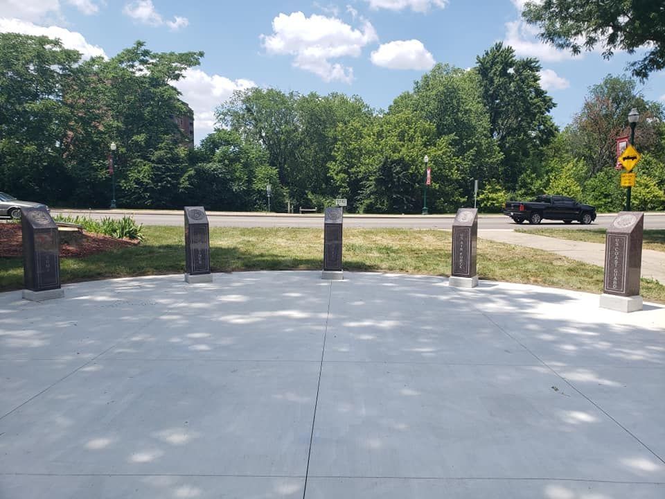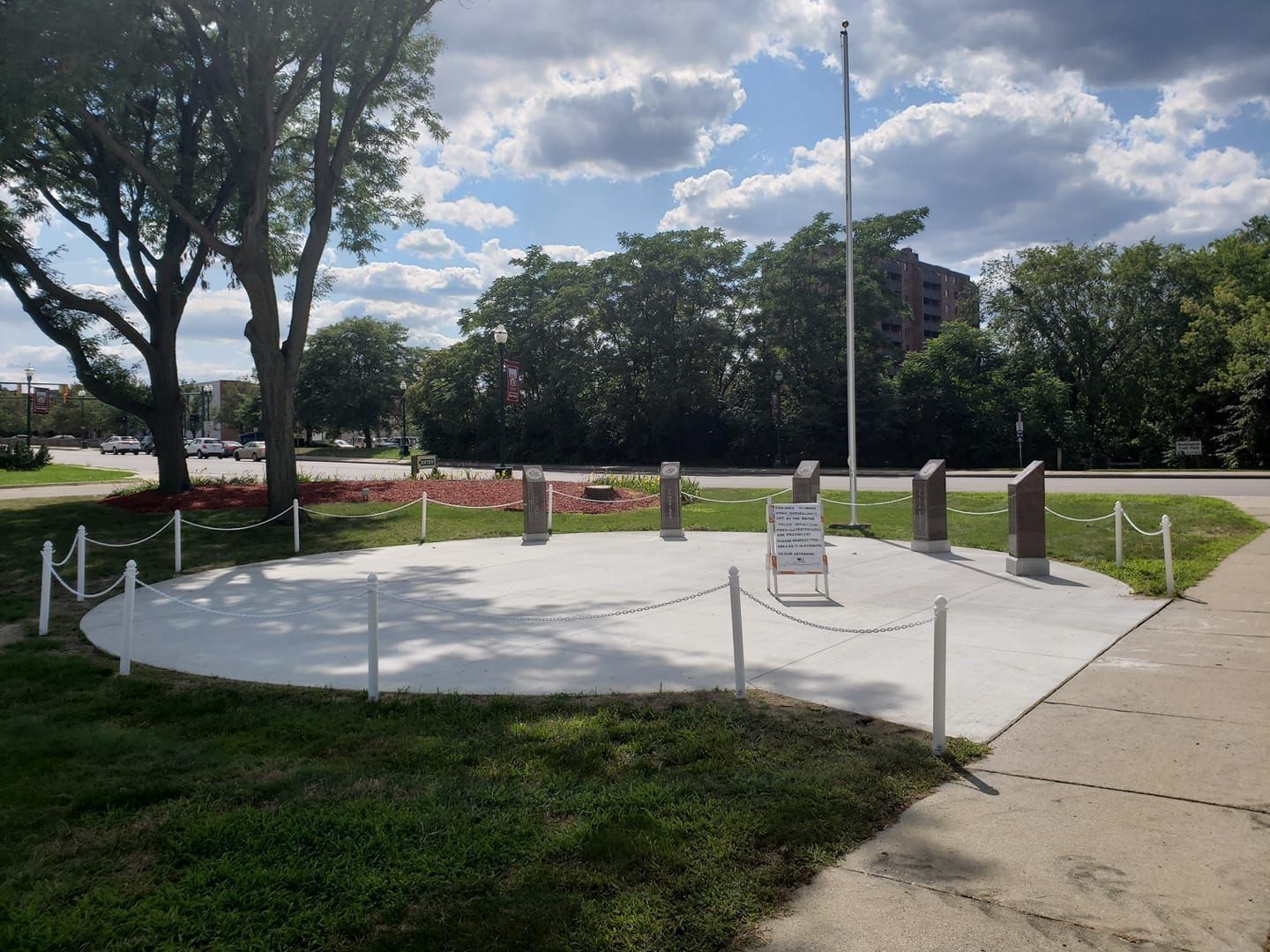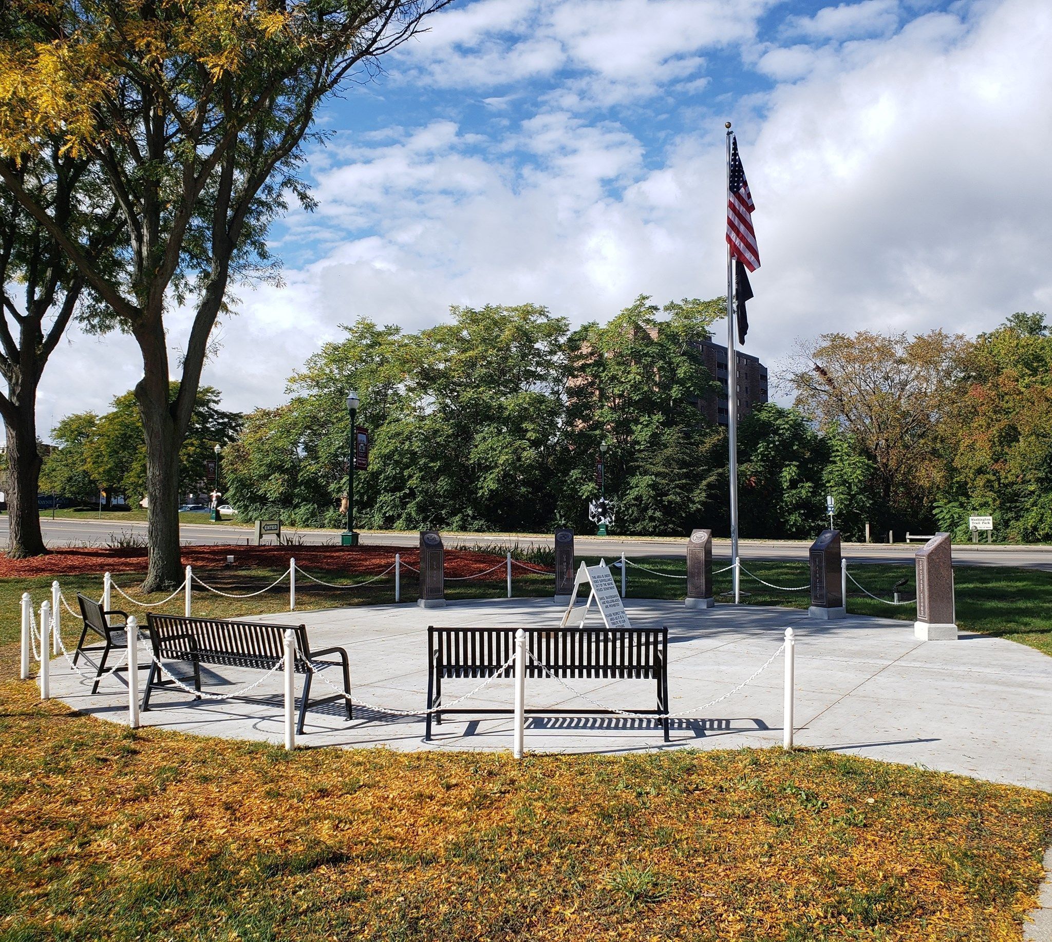 New Veterans Memorial - 2020. Built next to City Hall in Goudy Park. Carved Stones were donated from UAW Local 845 Veterans memorial formerly in Canton.Cataloged By
