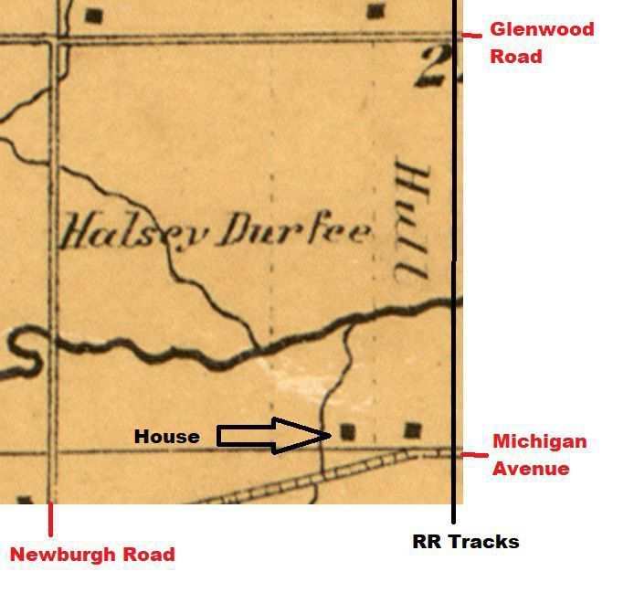 Durfee House - Michigan Avenue, North side just west of RR tracks. West of Stellwagen House. Roughly site today of Releaf/Wayne Bowl. Originally built by Halsey Durfee, later owned by Hugh Austin. Home no longer exists.Cataloged By