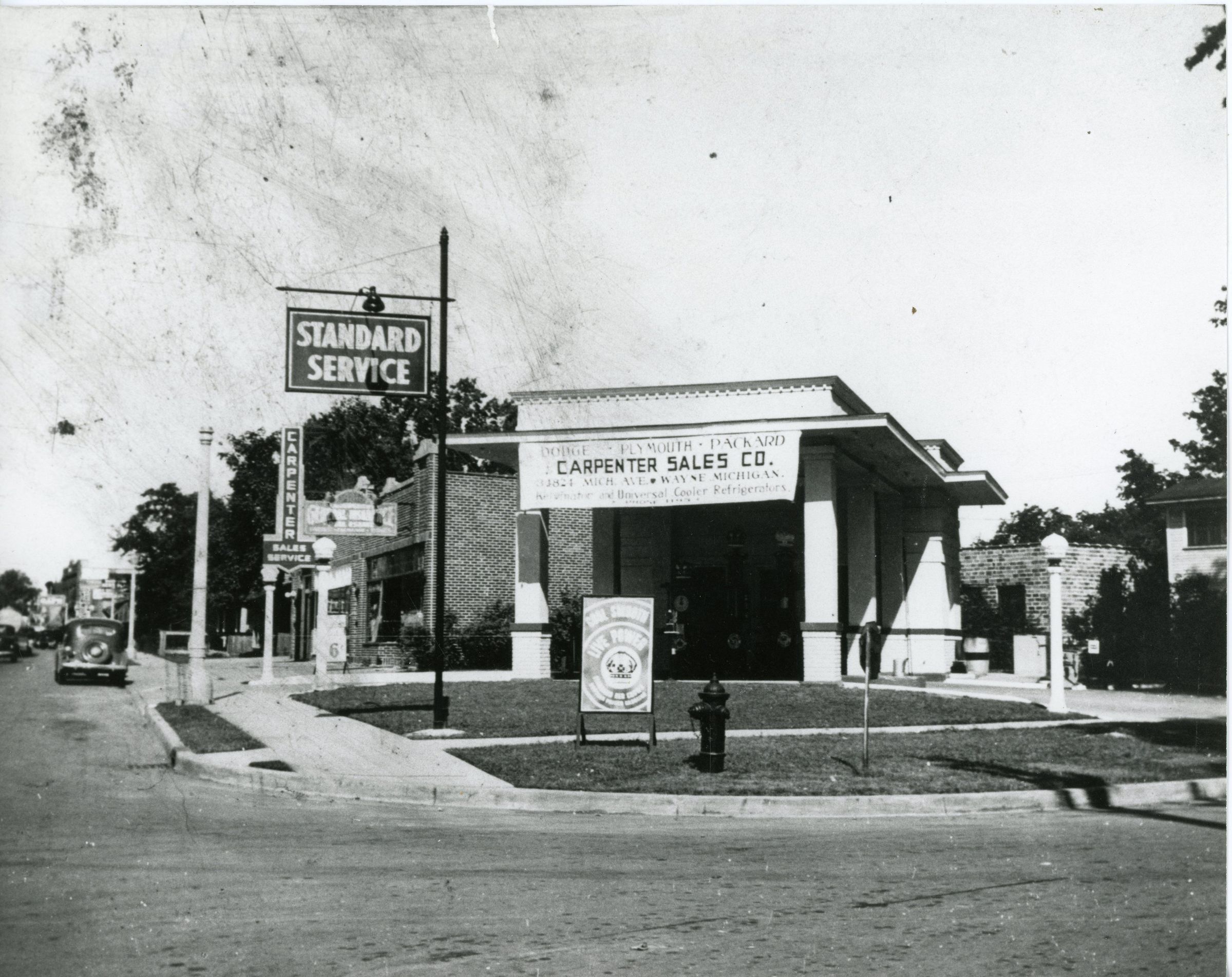 34806 Michigan - Carpenter Dodge, Plymouth, Packard sales and service. Michigan and 2nd st. Before 1917 E.H. Langworthy home was here, Standard Oil built this station during WWI, this picture from about 1938. Service station on corner was torn down and replaced with new gas station later.Cataloged By