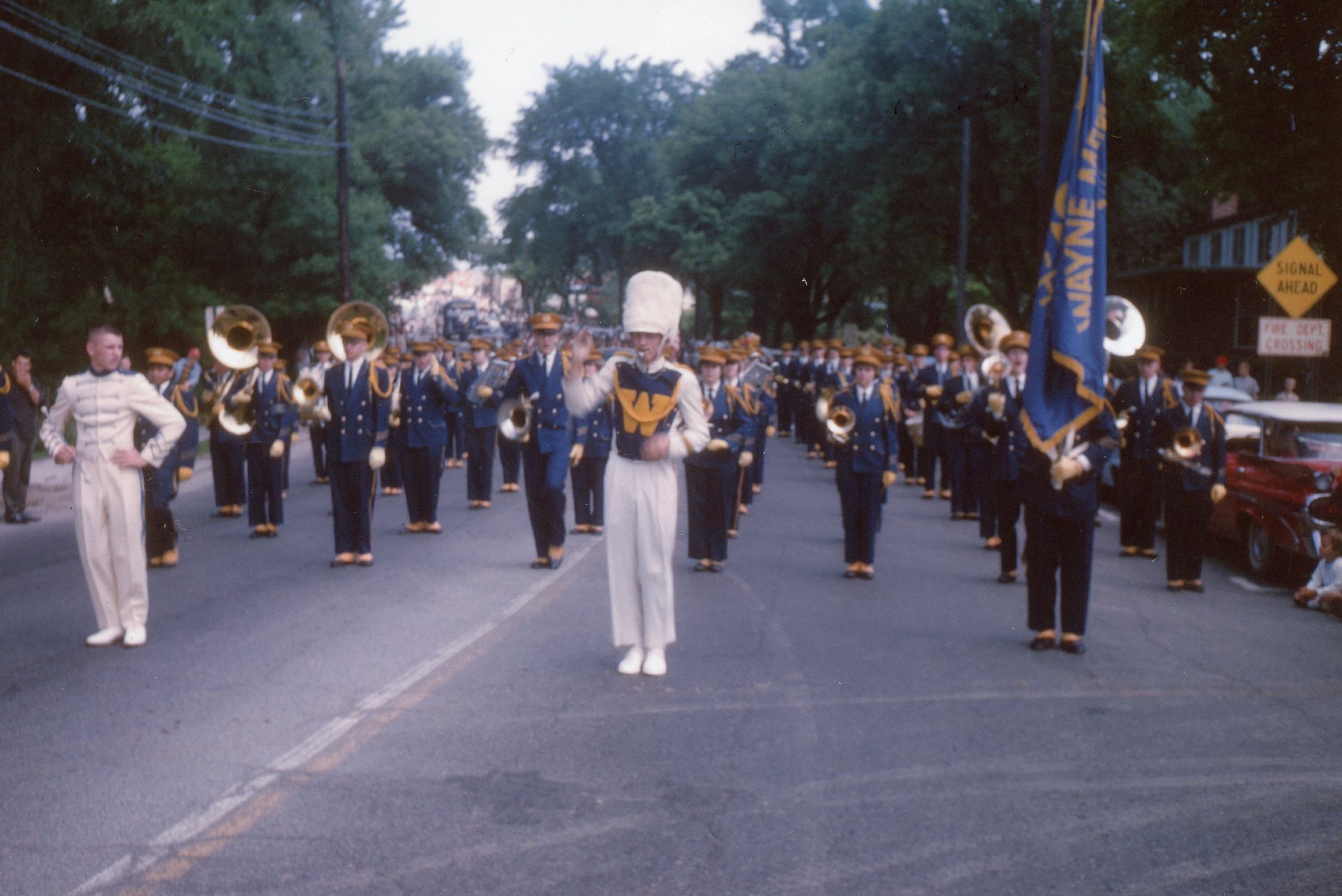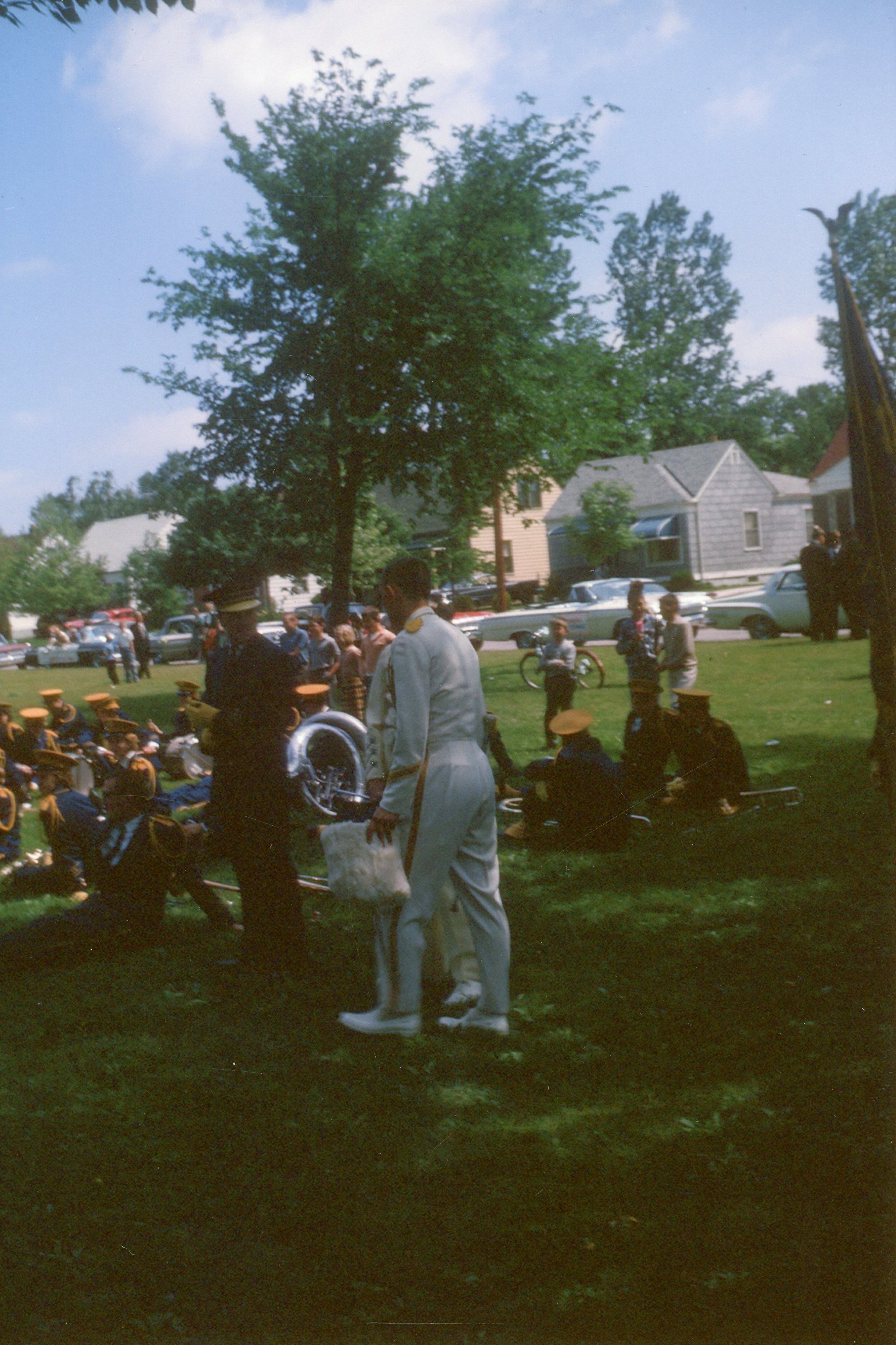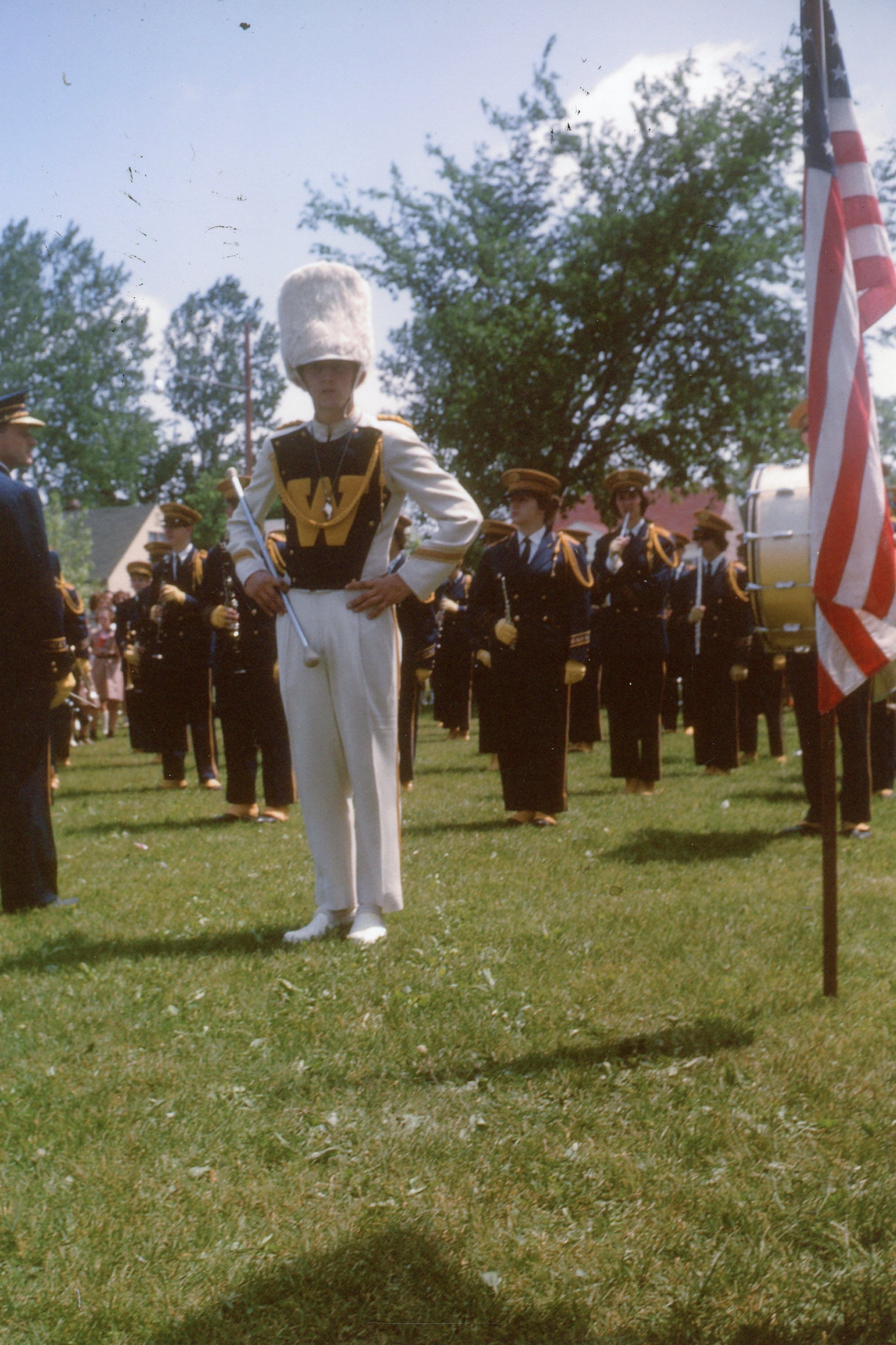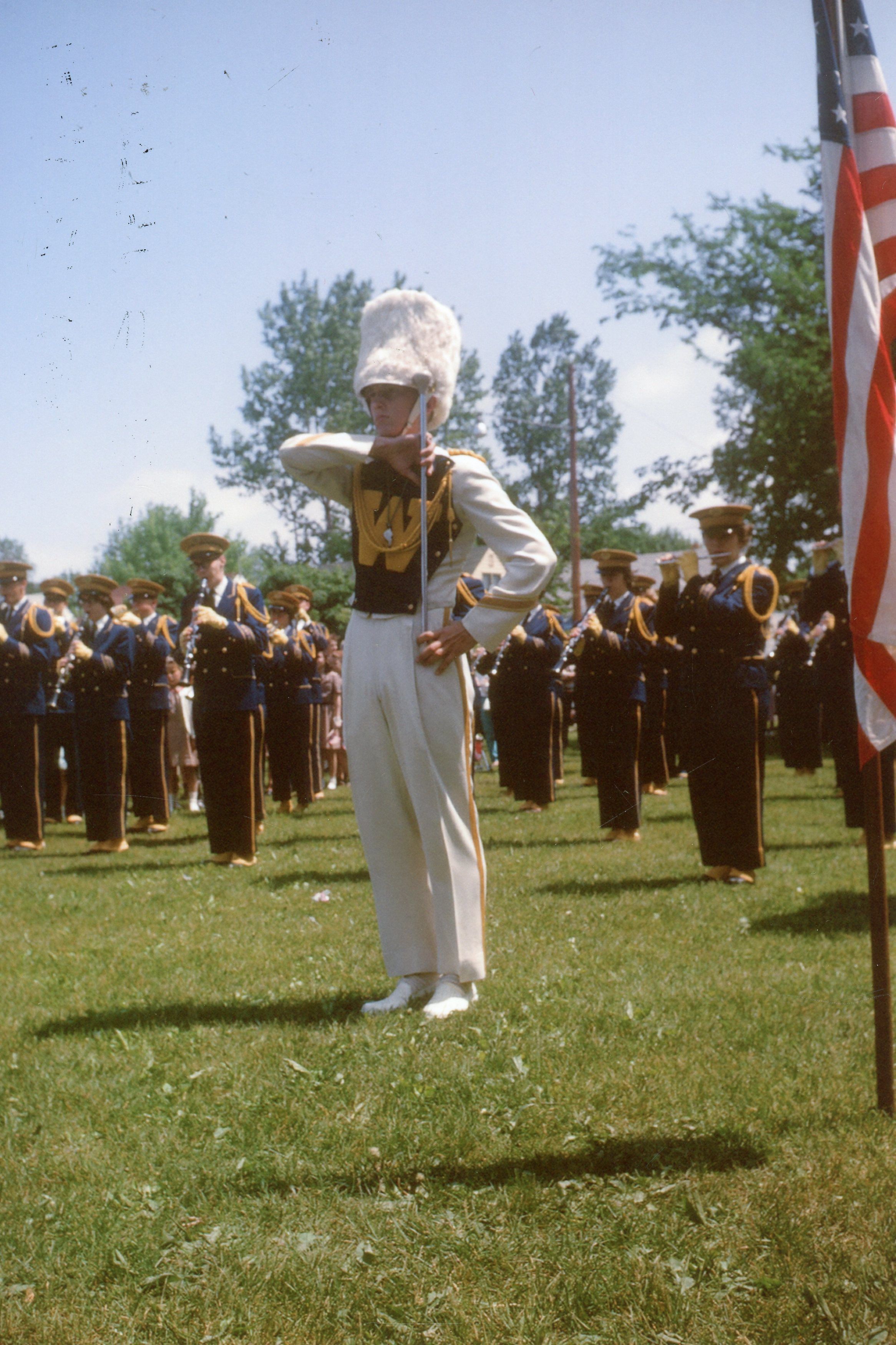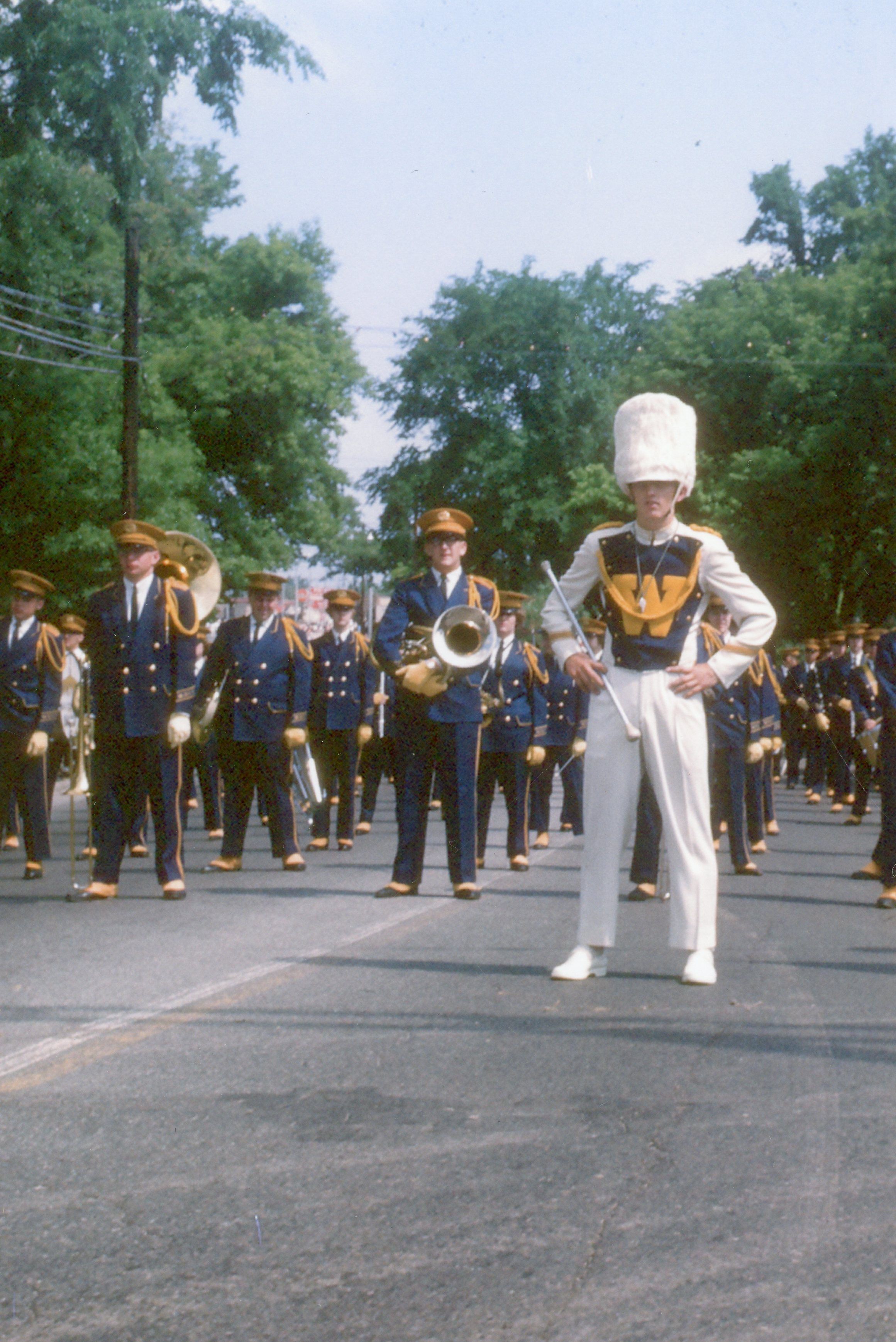 Wayne High School Band. Memorial day parade, unknown year. Wayne road, Monroe Street, to Jaycee park for ceremony. Jerry Johnston drum major