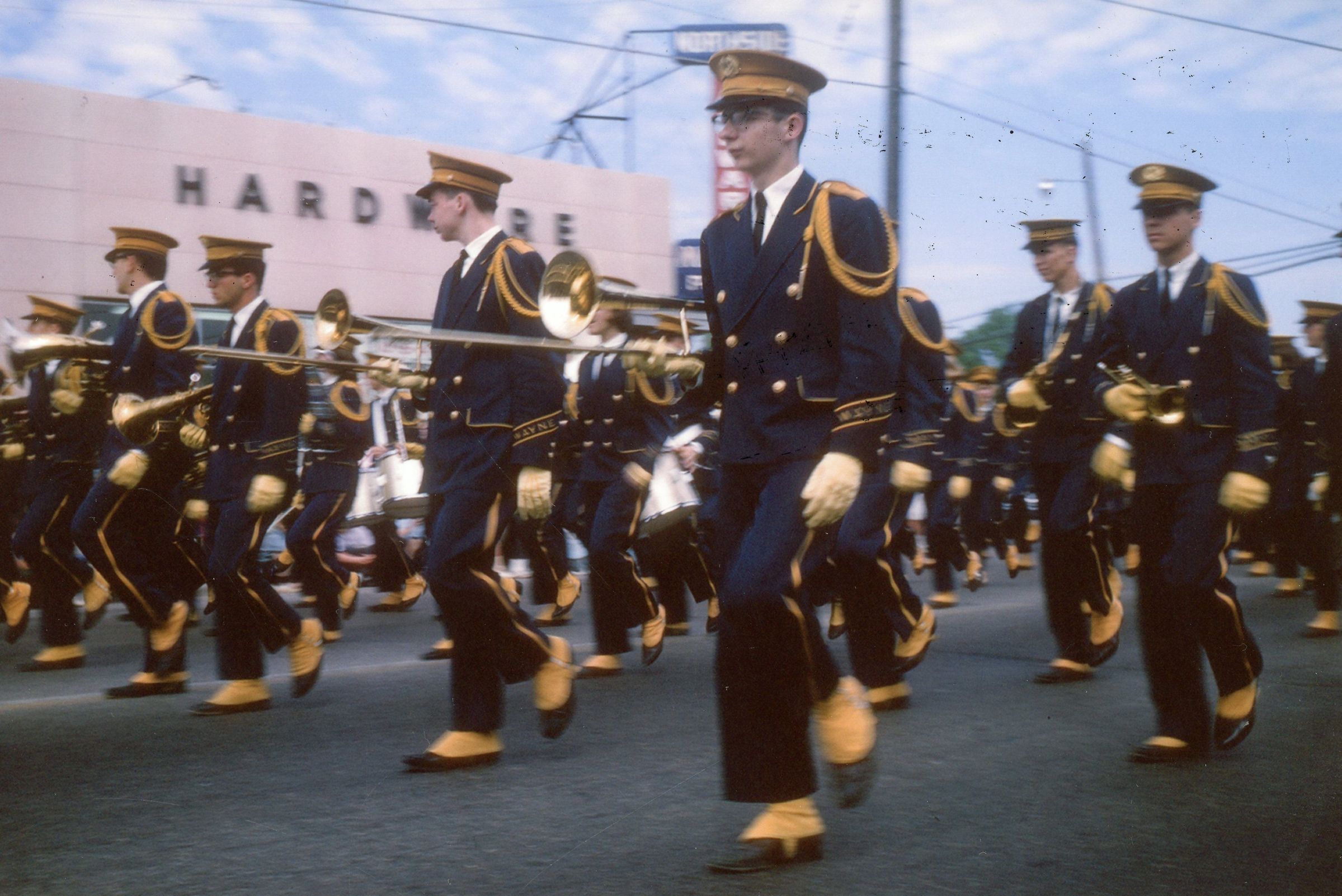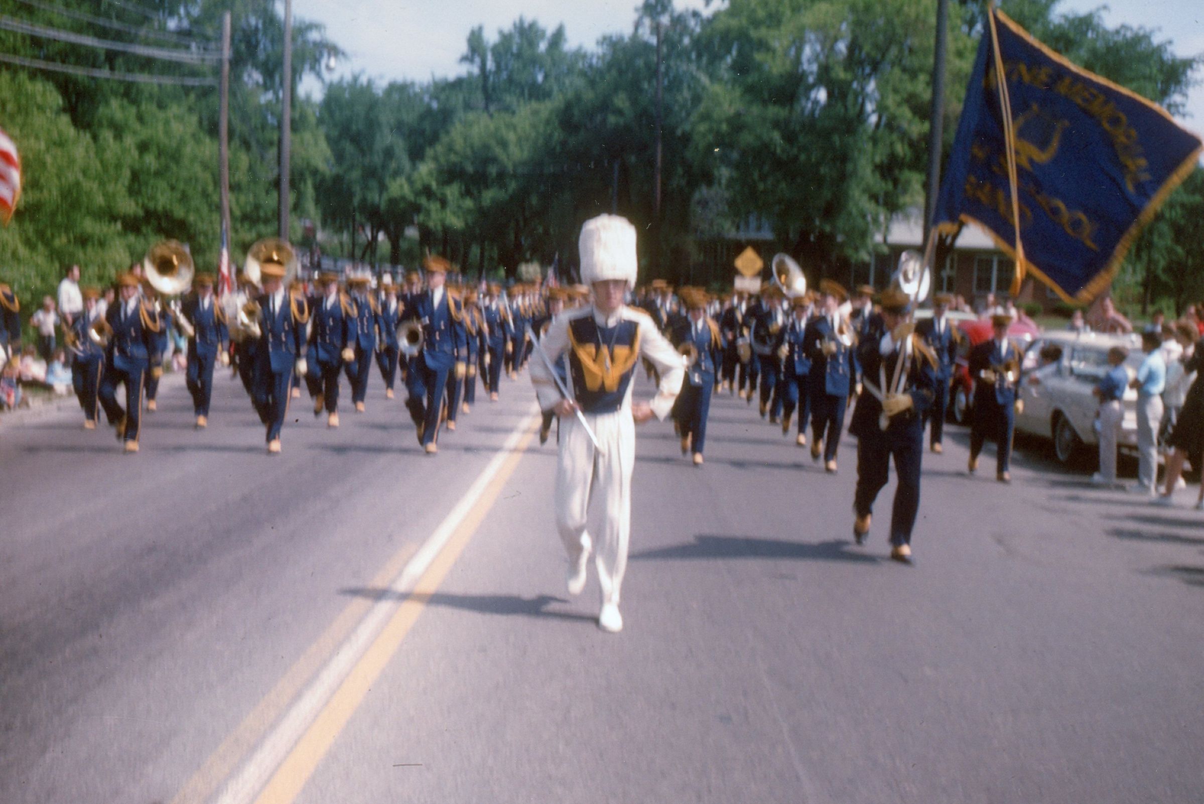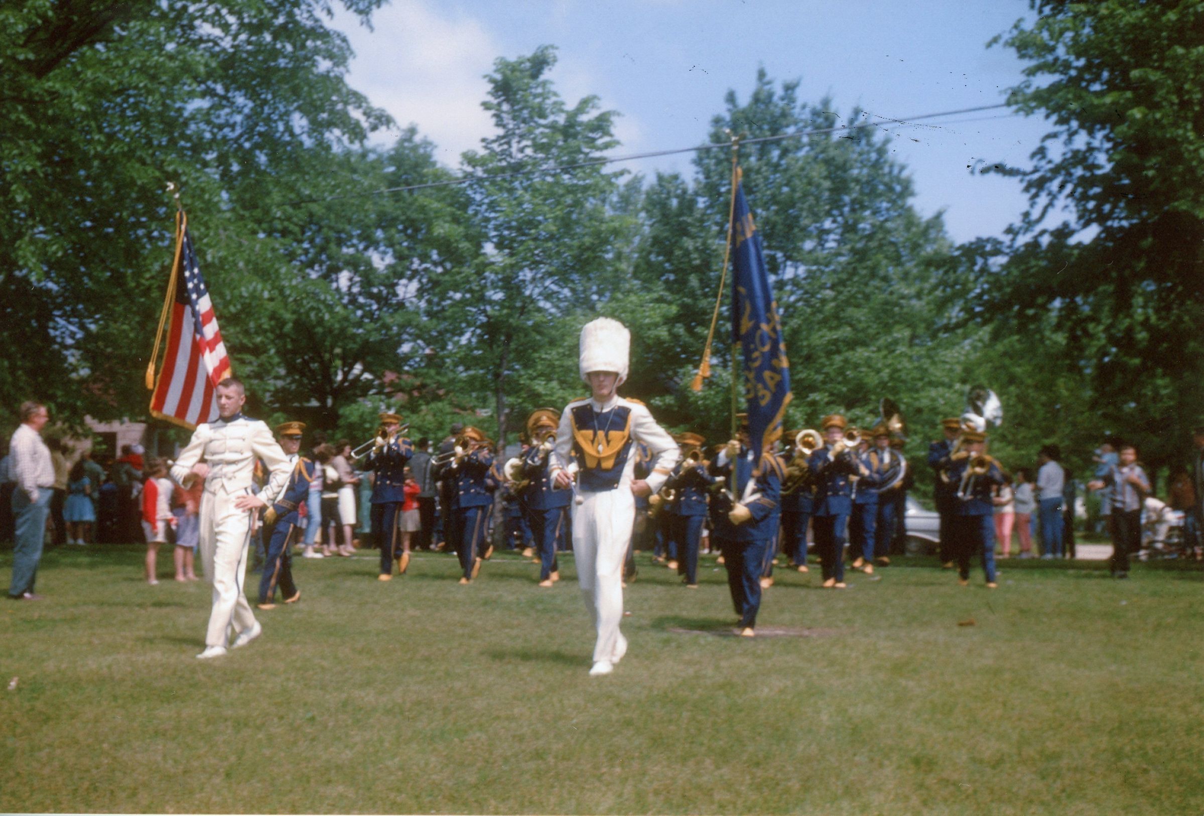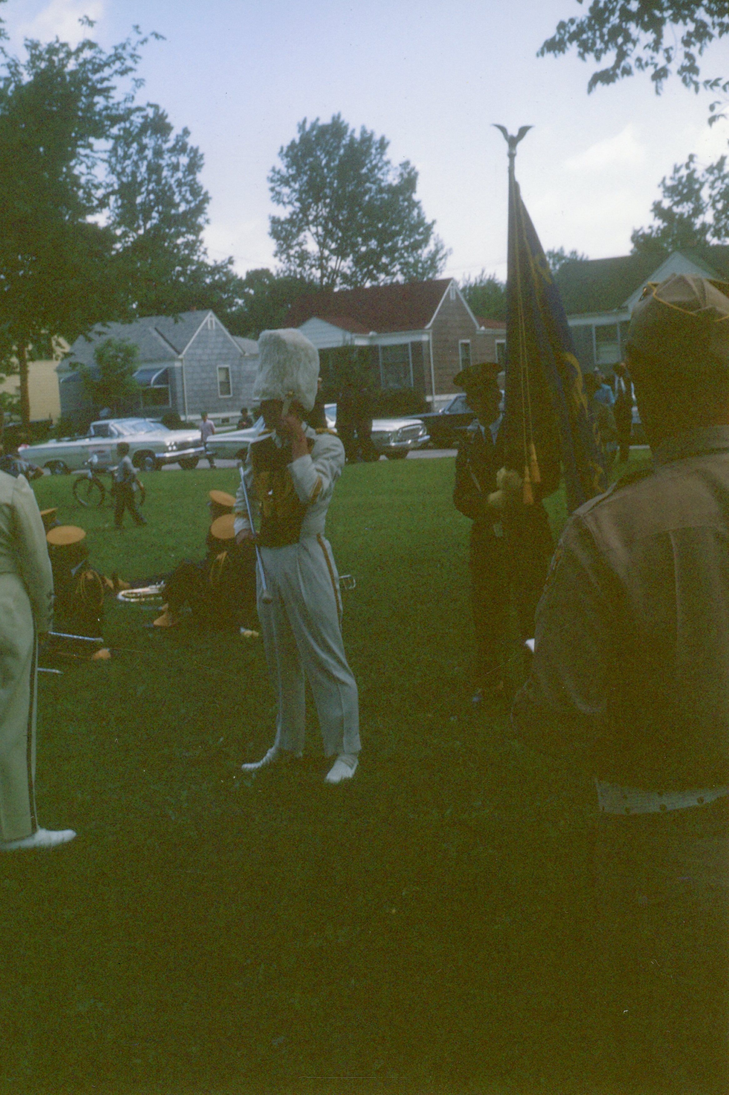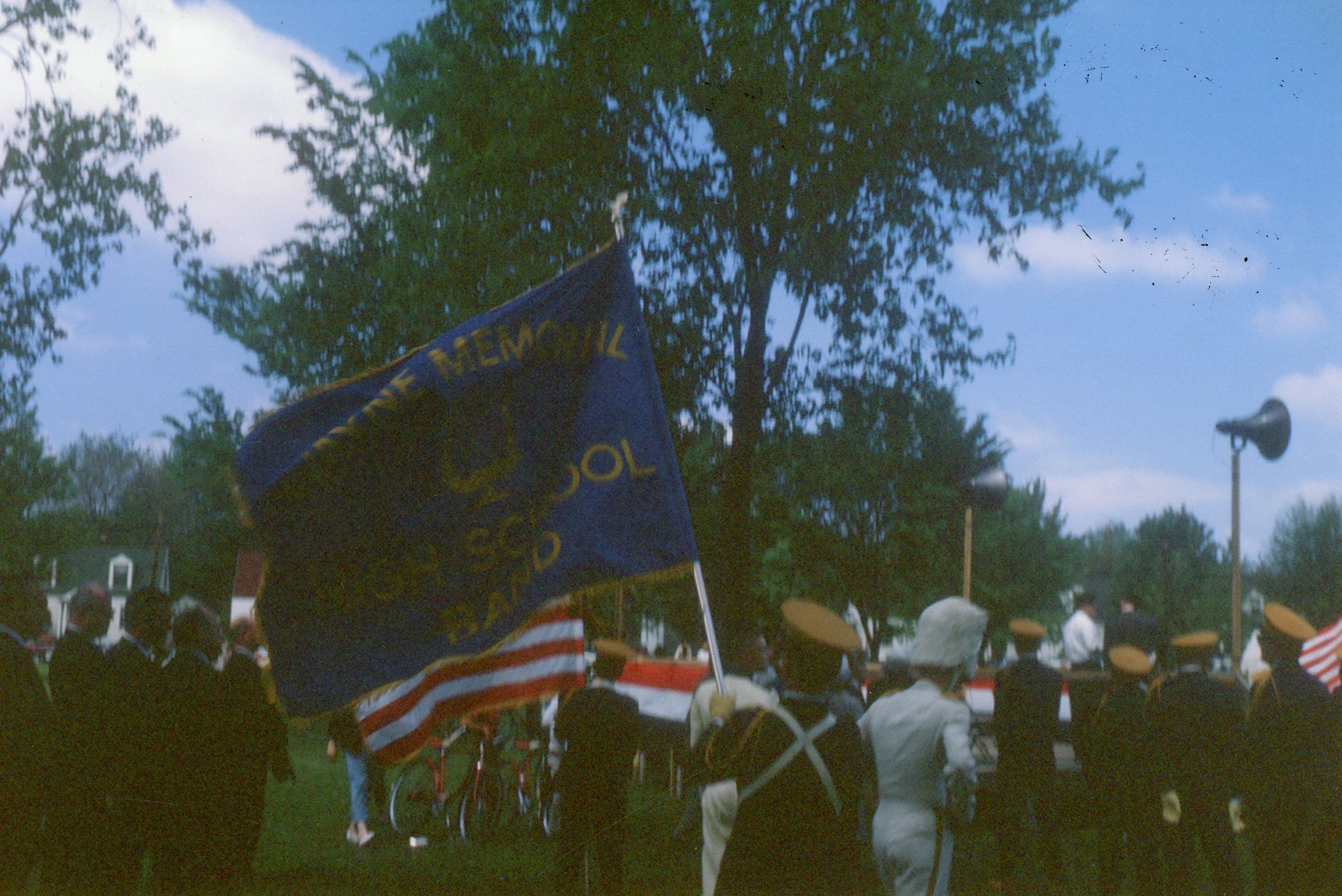 Wayne High School Band. Memorial day parade, unknown year. Wayne road, Monroe Street, to Jaycee park for ceremony. Jerry Johnston drum major