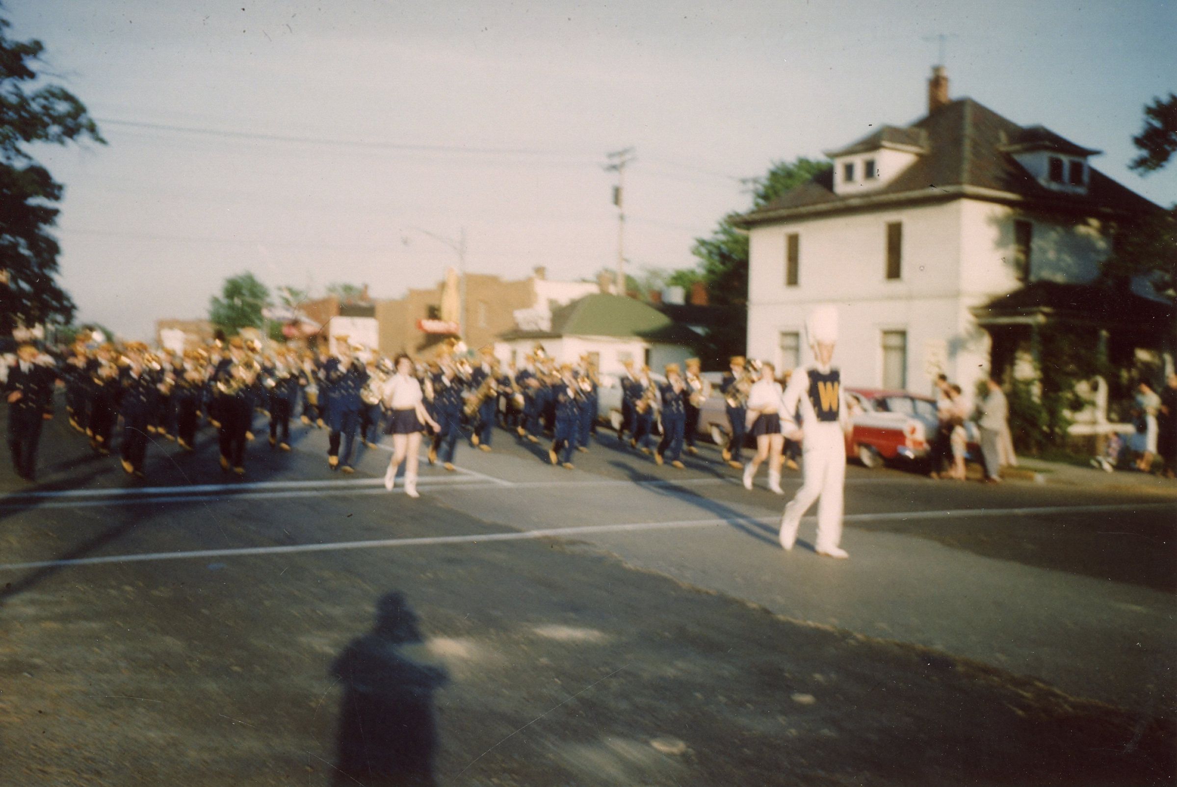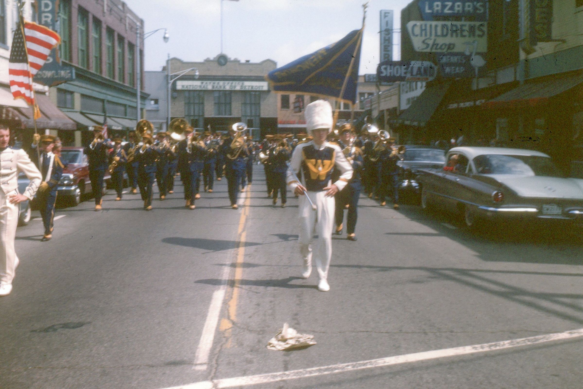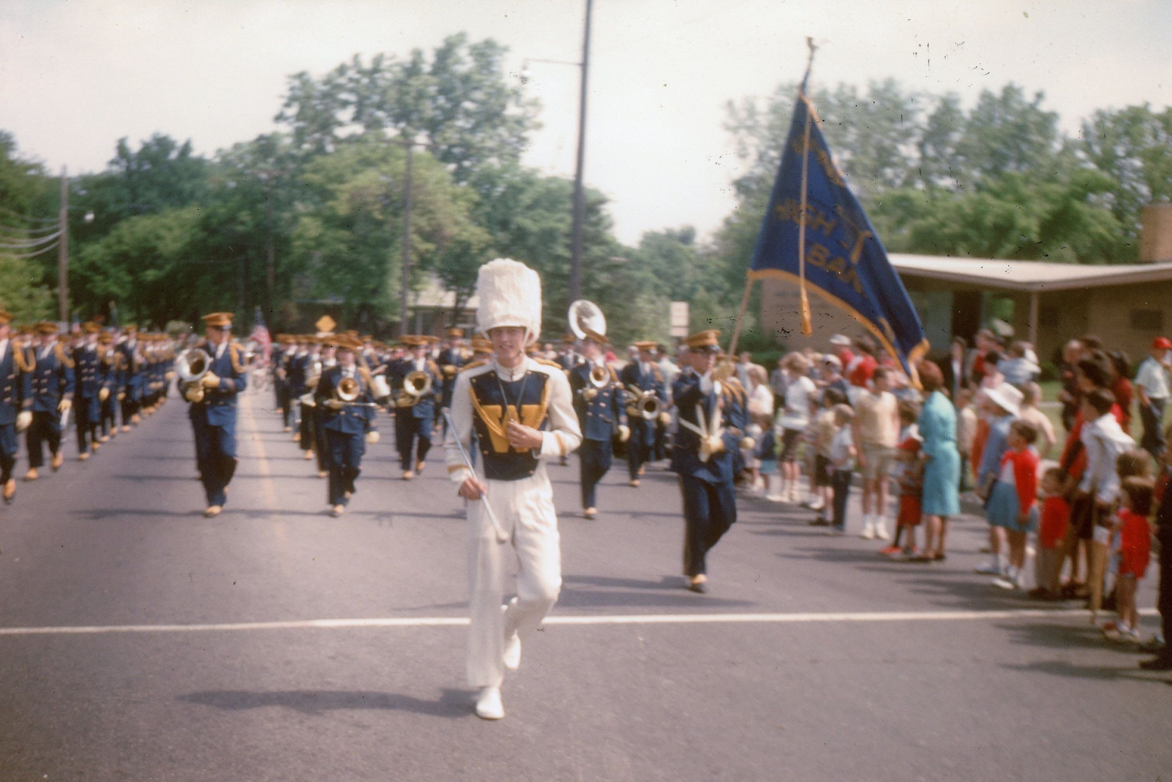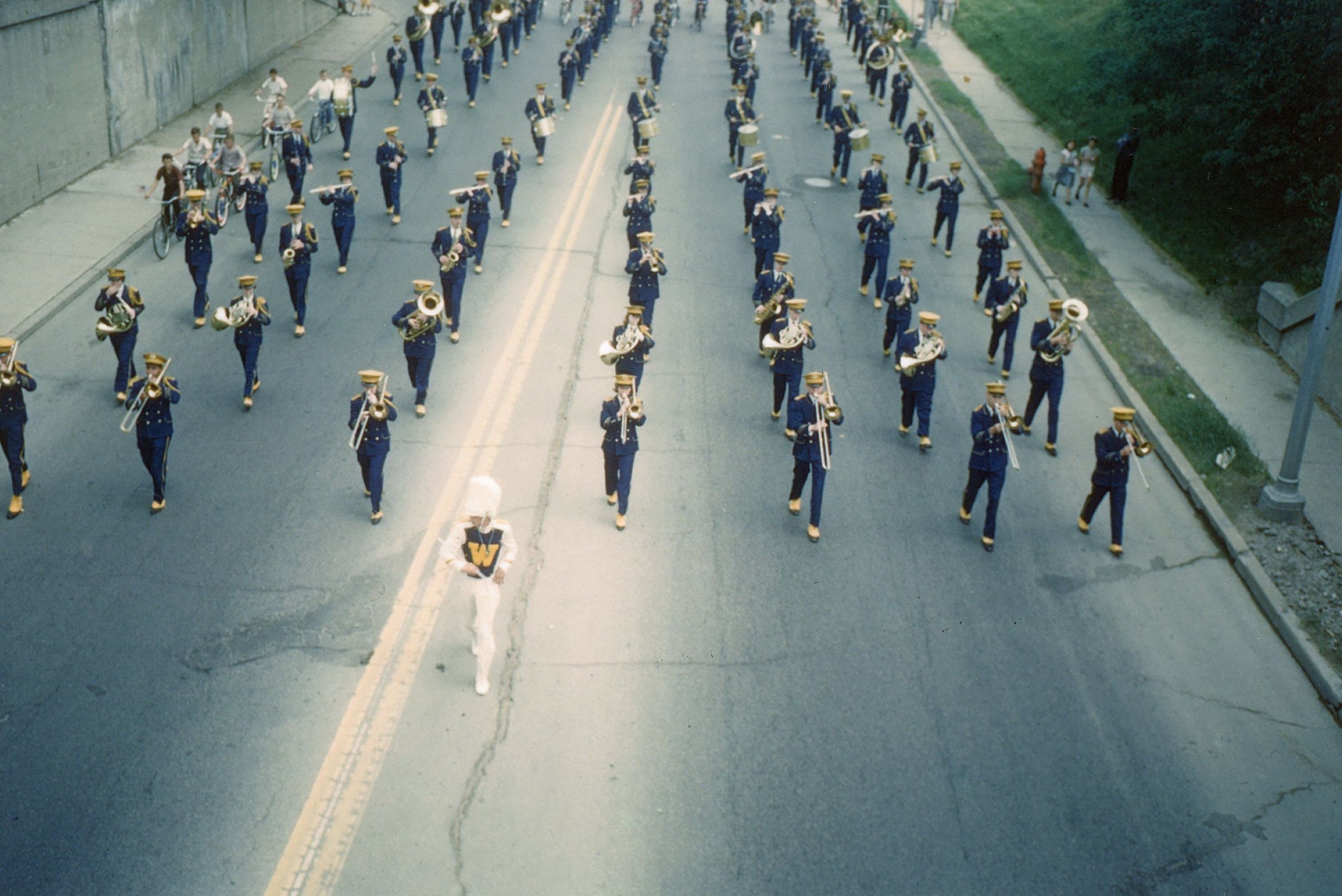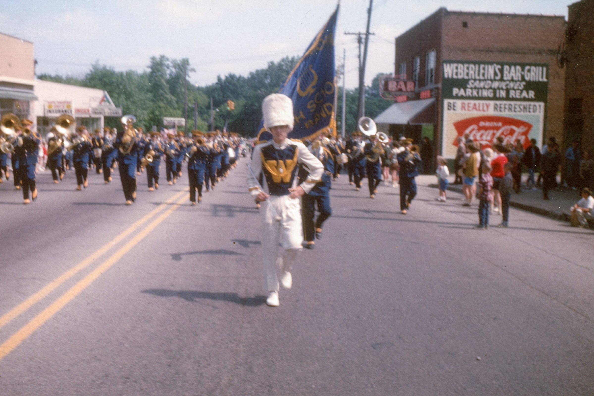 Wayne High School Band. Memorial day parade, unknown year. Wayne road, Monroe Street, to Jaycee park for ceremony. Jerry Johnston drum major
