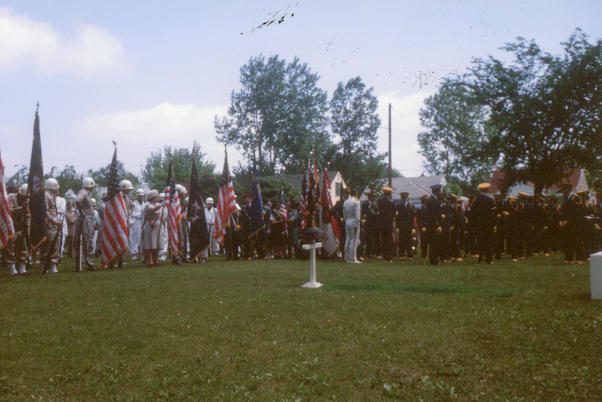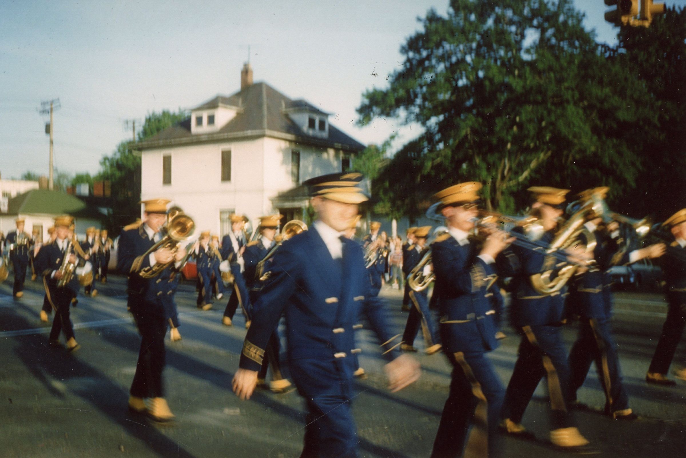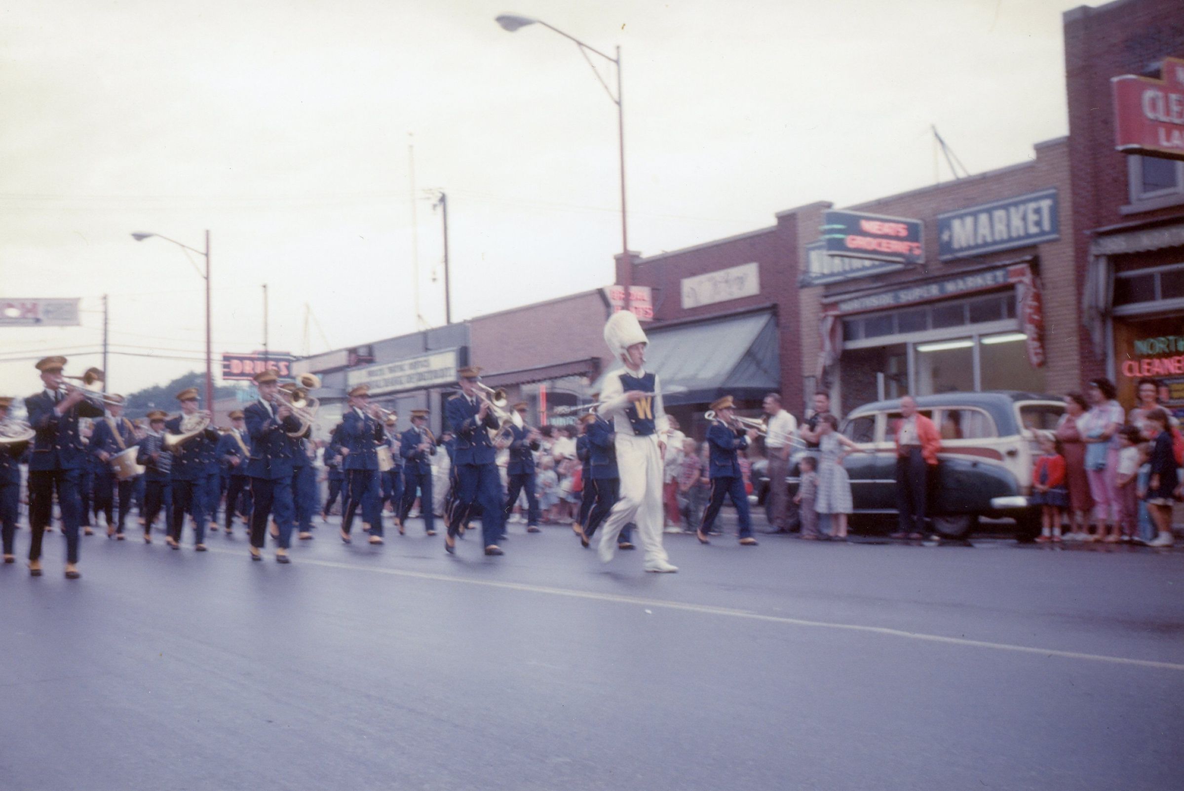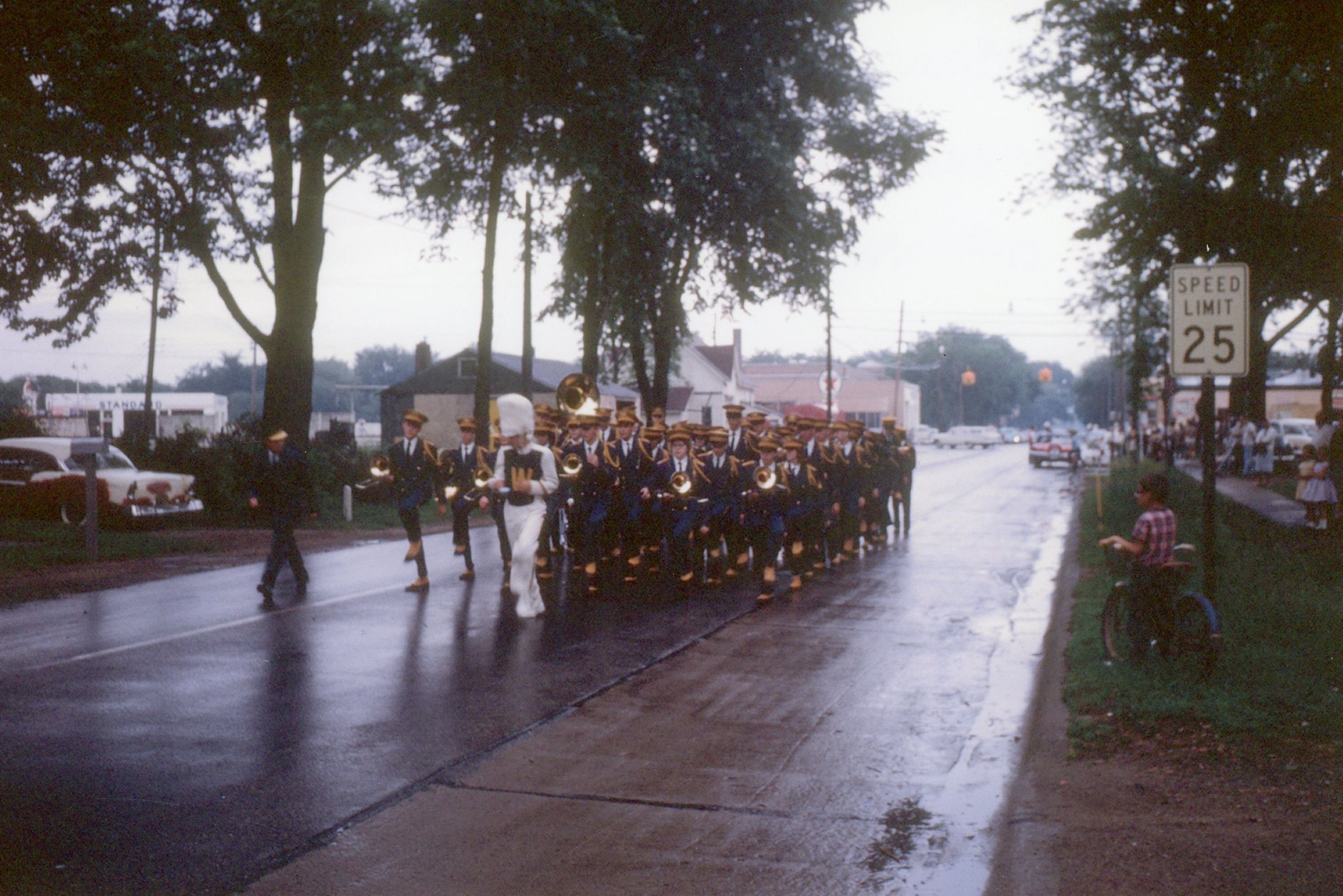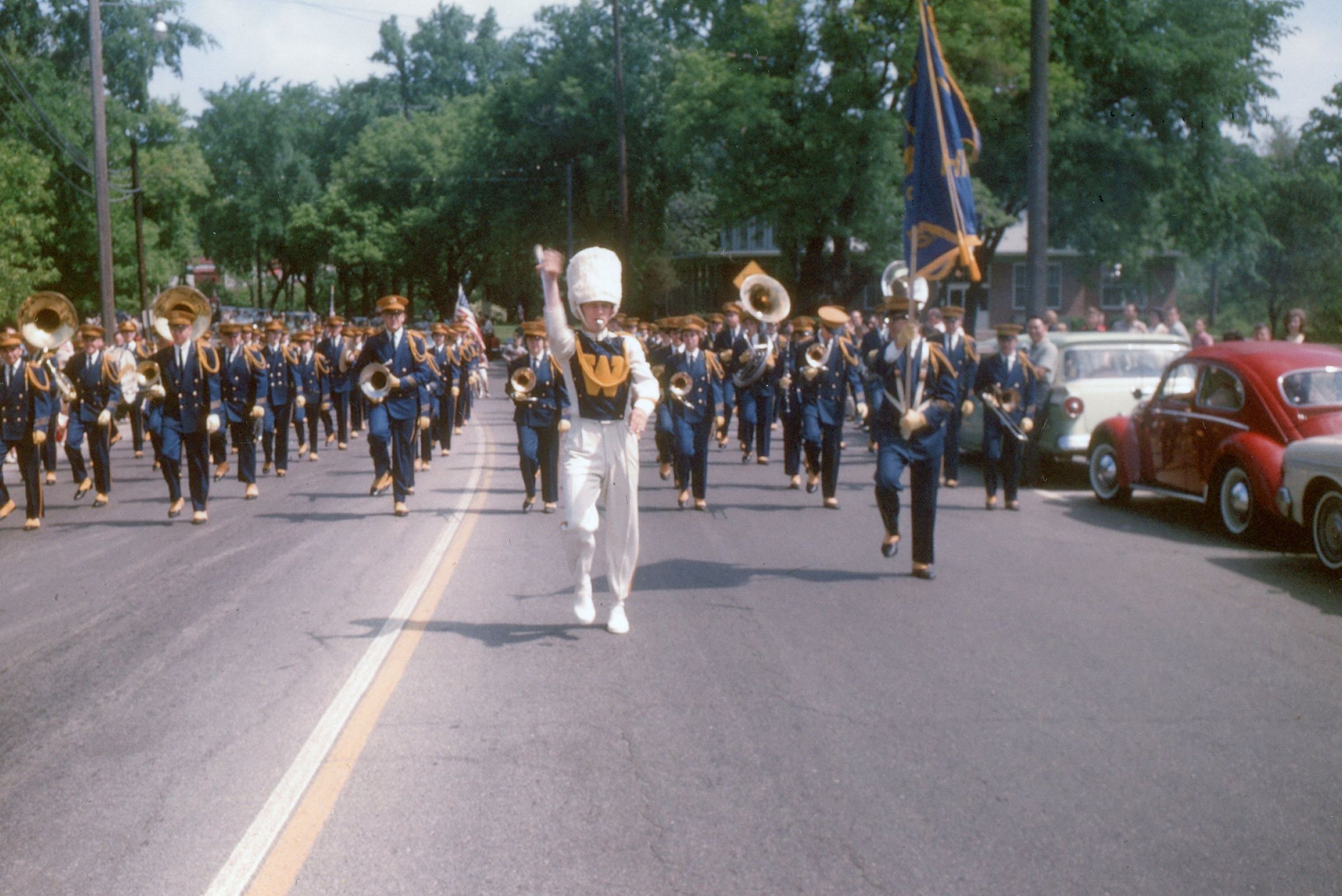 Wayne High School Band. Memorial day parade, unknown year. Wayne road, Monroe Street, to Jaycee park for ceremony. Jerry Johnston drum major