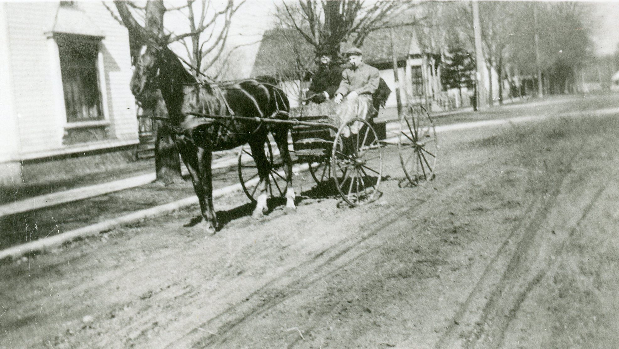 404 Newberry and 17 Main Street (3748 Newberry). West side of Newberry at Main Street. House on left torn down before 1926, house on right torn down before 1950. both for gas stations. P.J. Snyder and Ray Chambers in horse drawn cart. Horse and Wagon.Cataloged By