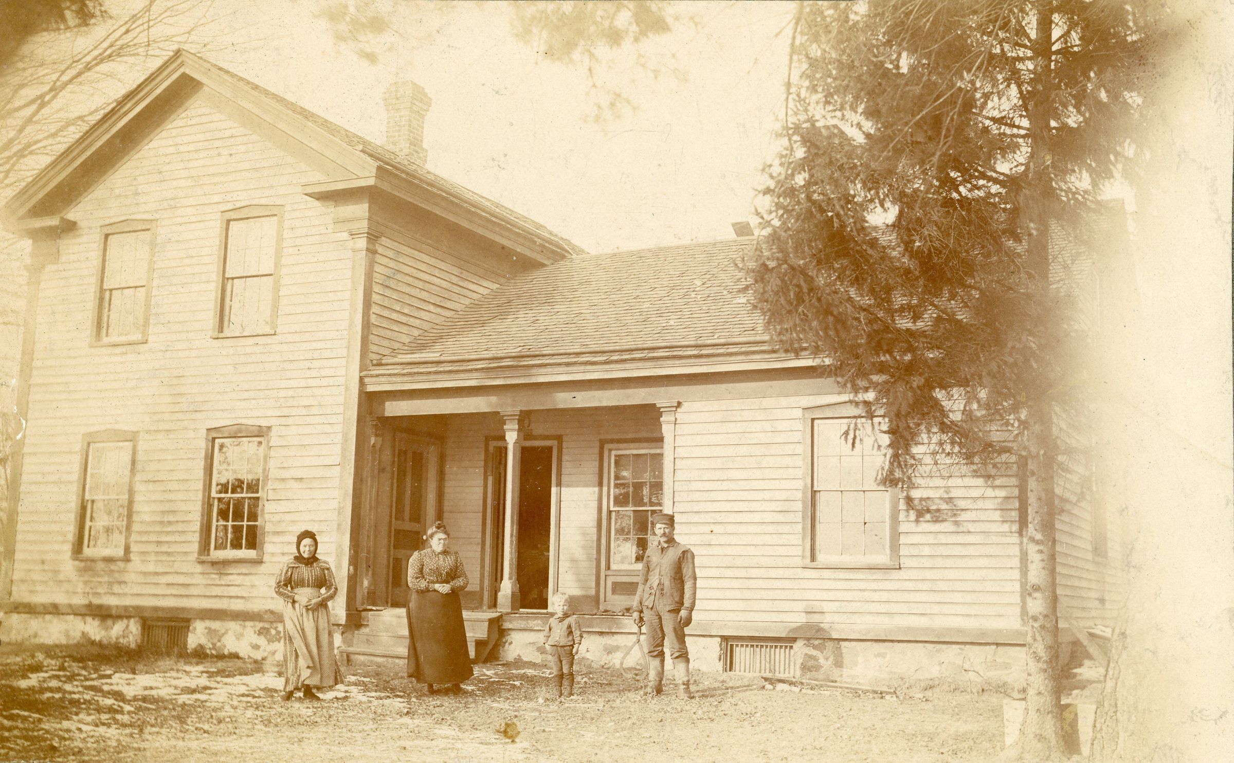 Bills Homestead 1902. Upright and wing farmhouse. NE corner of Cherry Hill & Middlebelt. (L-R) Mrs. Leverance, Esther Rounds Bills, Arthur Bills (B. 1898), Samuel Bills.Cataloged By