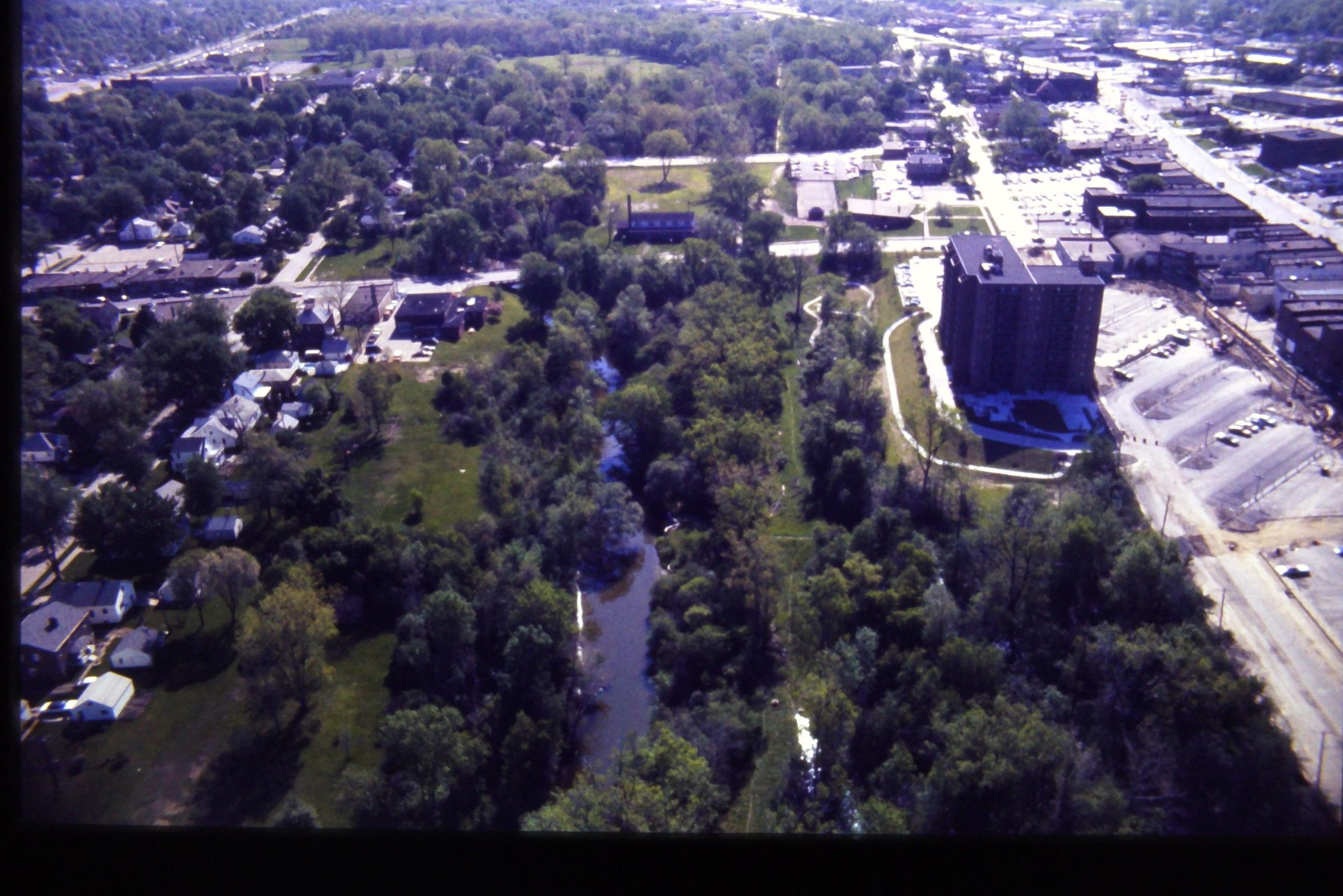 Aerial over Rouge River, Sims and Wayne Road, looking East 1970s