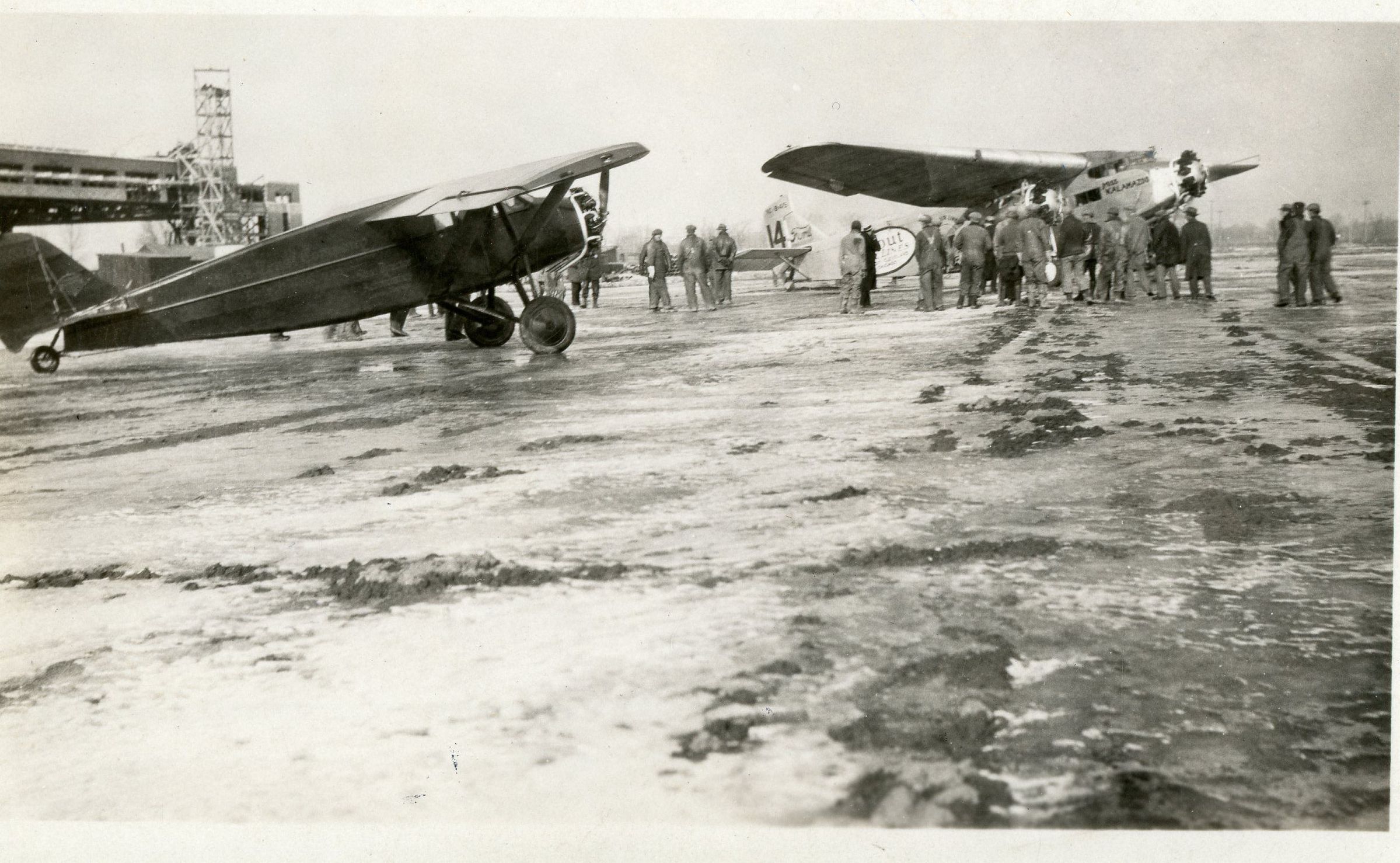 First landing. Stinson plane on left & Ford Tri-Motor (stout designed)
