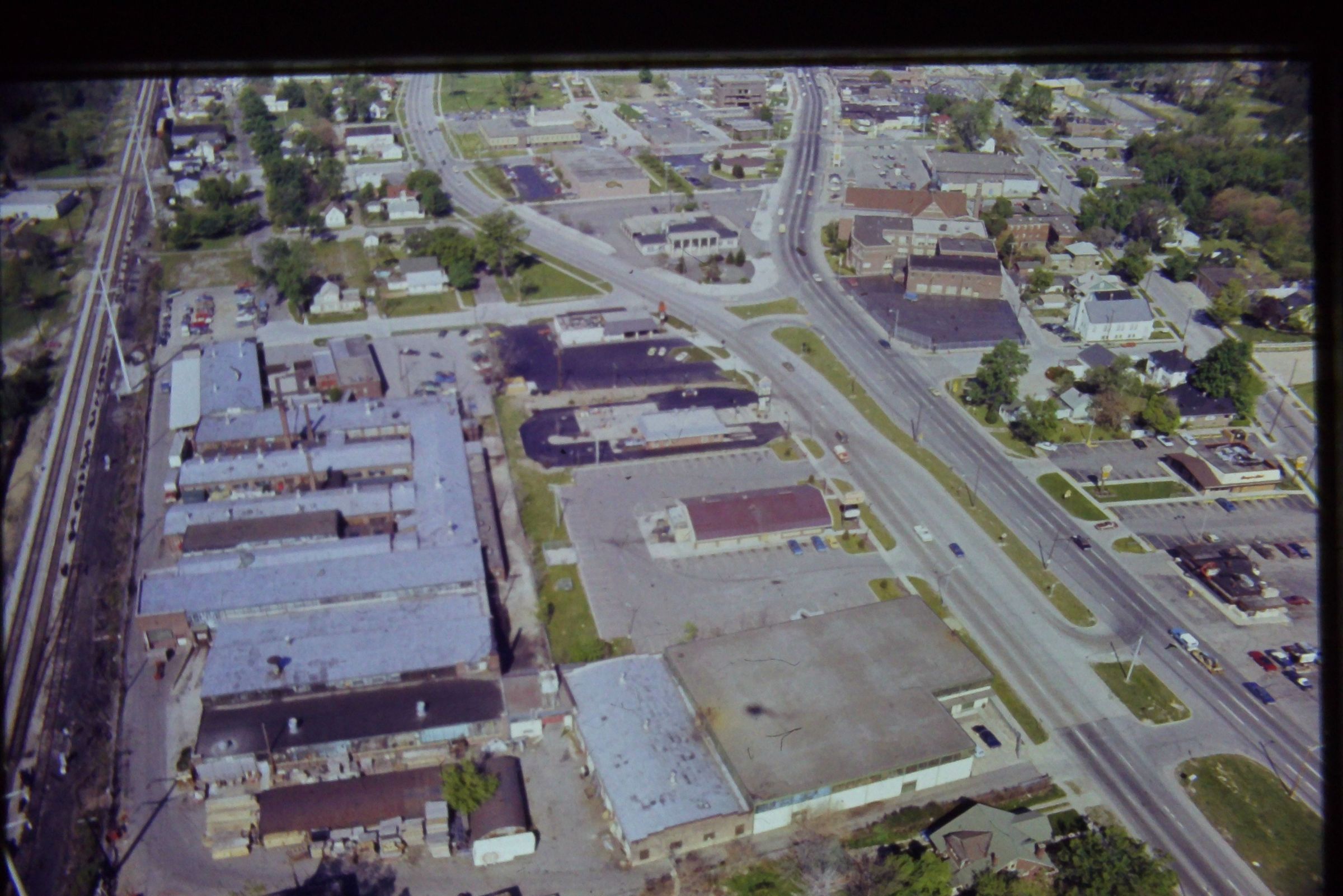 Aerial over Michigan Avenue, looking West. Old Purolator plant in bottom left. 1970s, post urban renewal