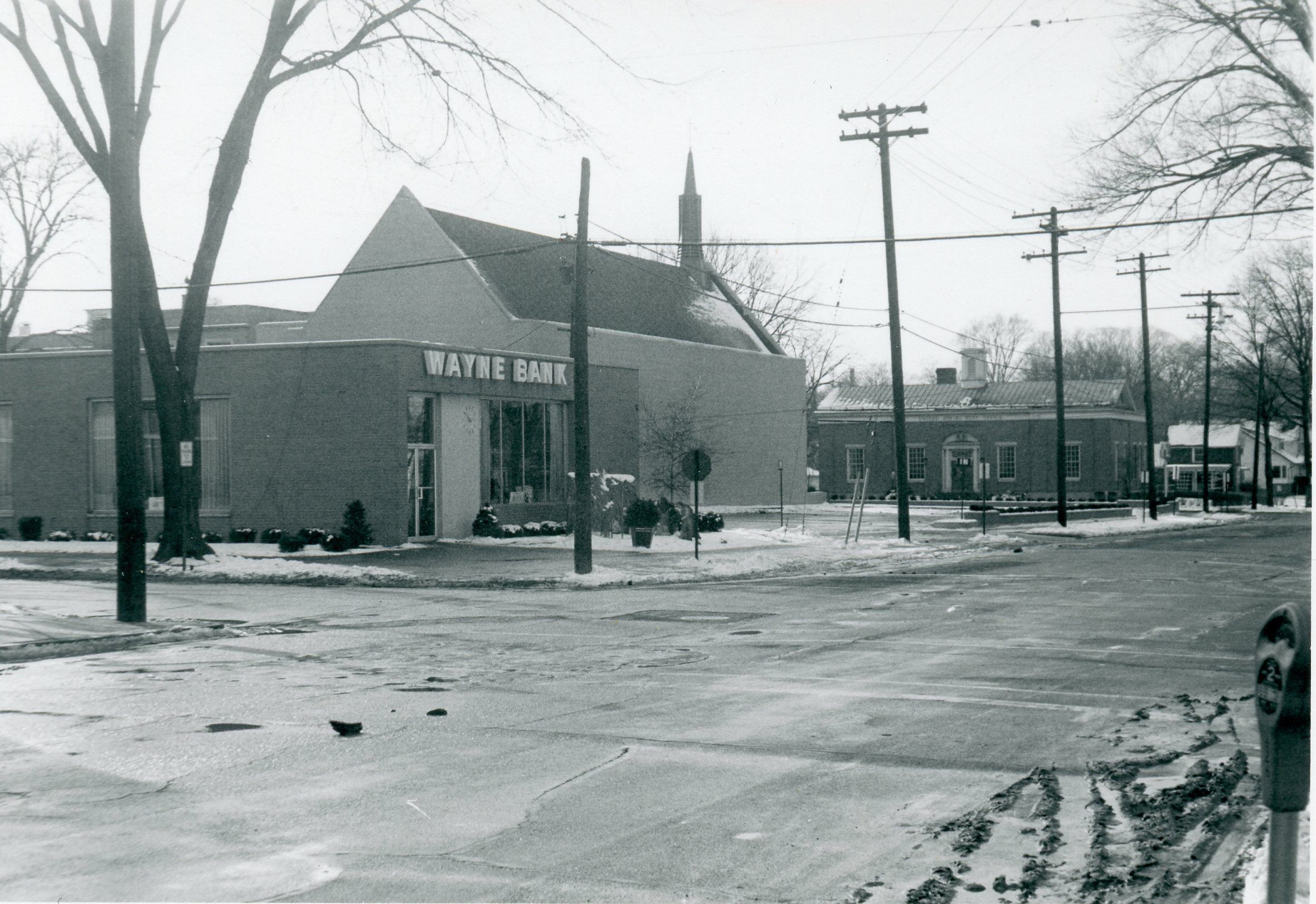 Park at Biddle Looking West. Wayne Bank, Methodist Church and Post Office Visible.