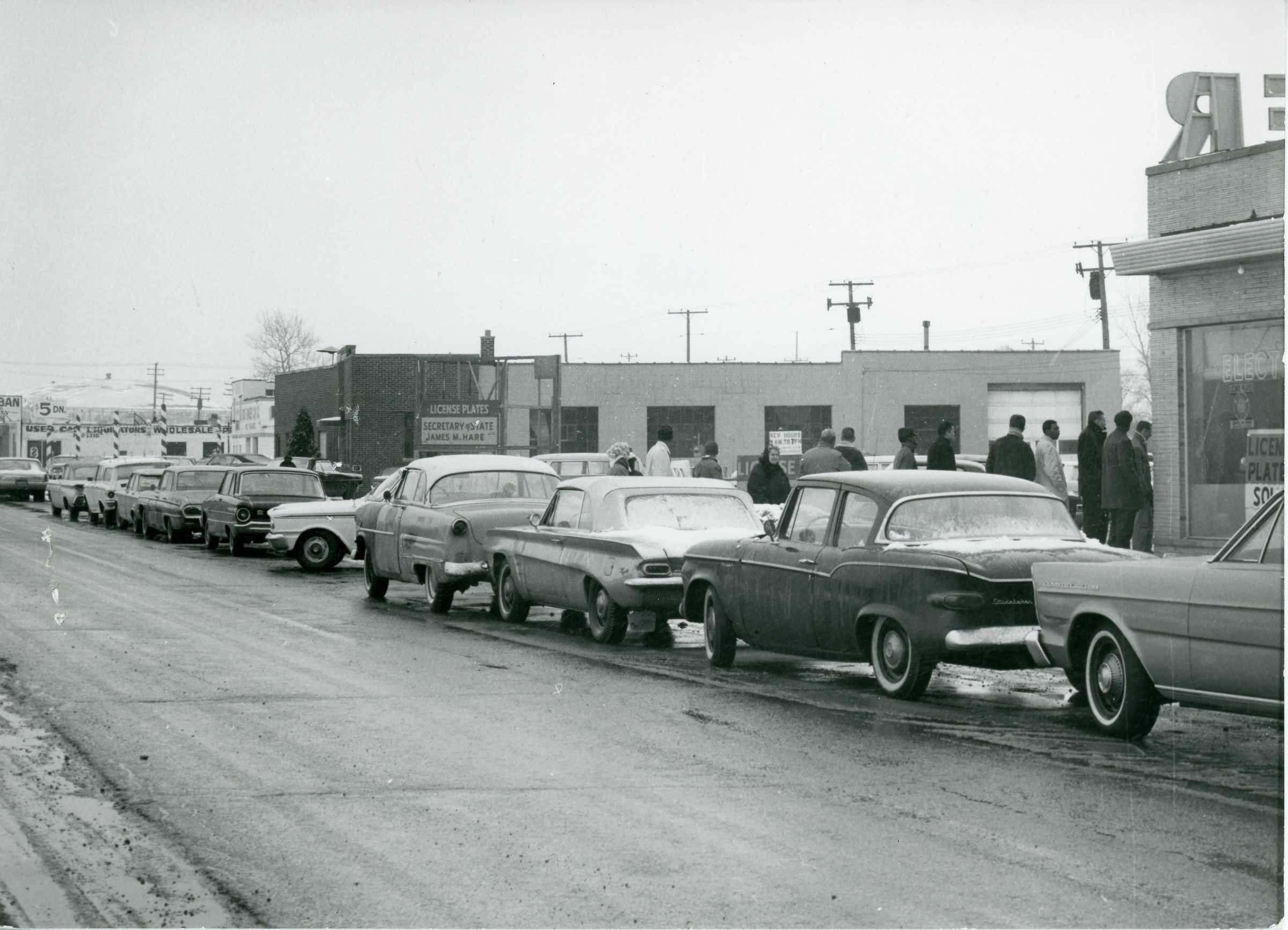 31657 and 31731Michigan. Garage in center is 31657 Michigan, Secretary of state office at right was 31731 Michigan. March 1 1967, line to get new license plates before tickets given out.Cataloged By