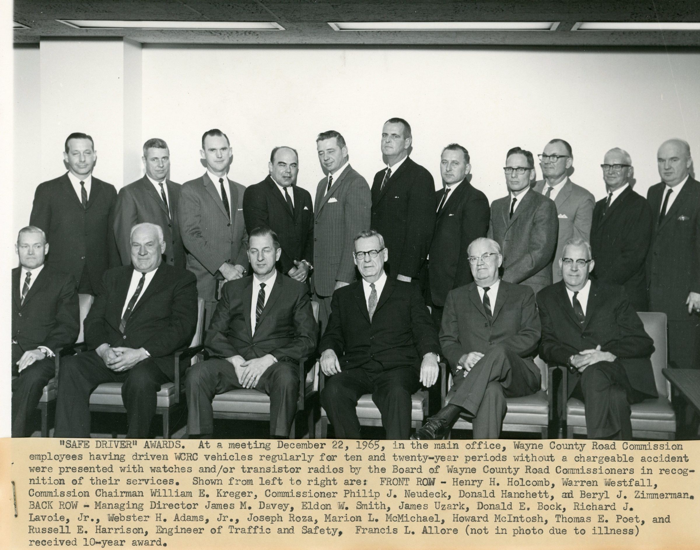 "Safe Driver" Awards Meeting on December 22, 1965. At the meeting, Wayne County Road Commission employees having driven WCRC vehicles regularly for 10 and 20 year periods without a chargeable accident were presented with watches and/or transistor radios by the Board of Wayne County Road Commissioners in recognition of their services. LtoR Front Row: Henry H. Holcomb, Warren Westfall, Commission Chairman William E. Kreger, Commissioner Philip J. Neudeck, Donald Hanchett, and Beryl J. Zimmerman. Back Row: Managing Director James M. Davey, Eldon W. Smith, James Uzark, Donald E. Bock, Richard J. Lavoie, Jr., Webster H. Adams, Jr., Joseph Roza, Marion L. McMichael, Howard McIntosh, Thomas E. Poet, and Russell E. Harrison, Engineer of Traffic Safety, Francis L. Allore (Not pictured) recieved 10 year award.Cataloged By