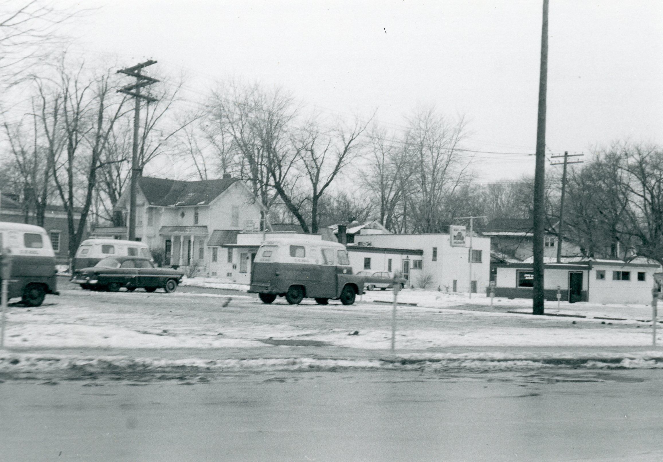 West side of Newberry between Park and Michigan Ave. Taken From Michigan looking SW. 35304 Main (Large white house) visible, George Smith Tailoring shop.Cataloged By