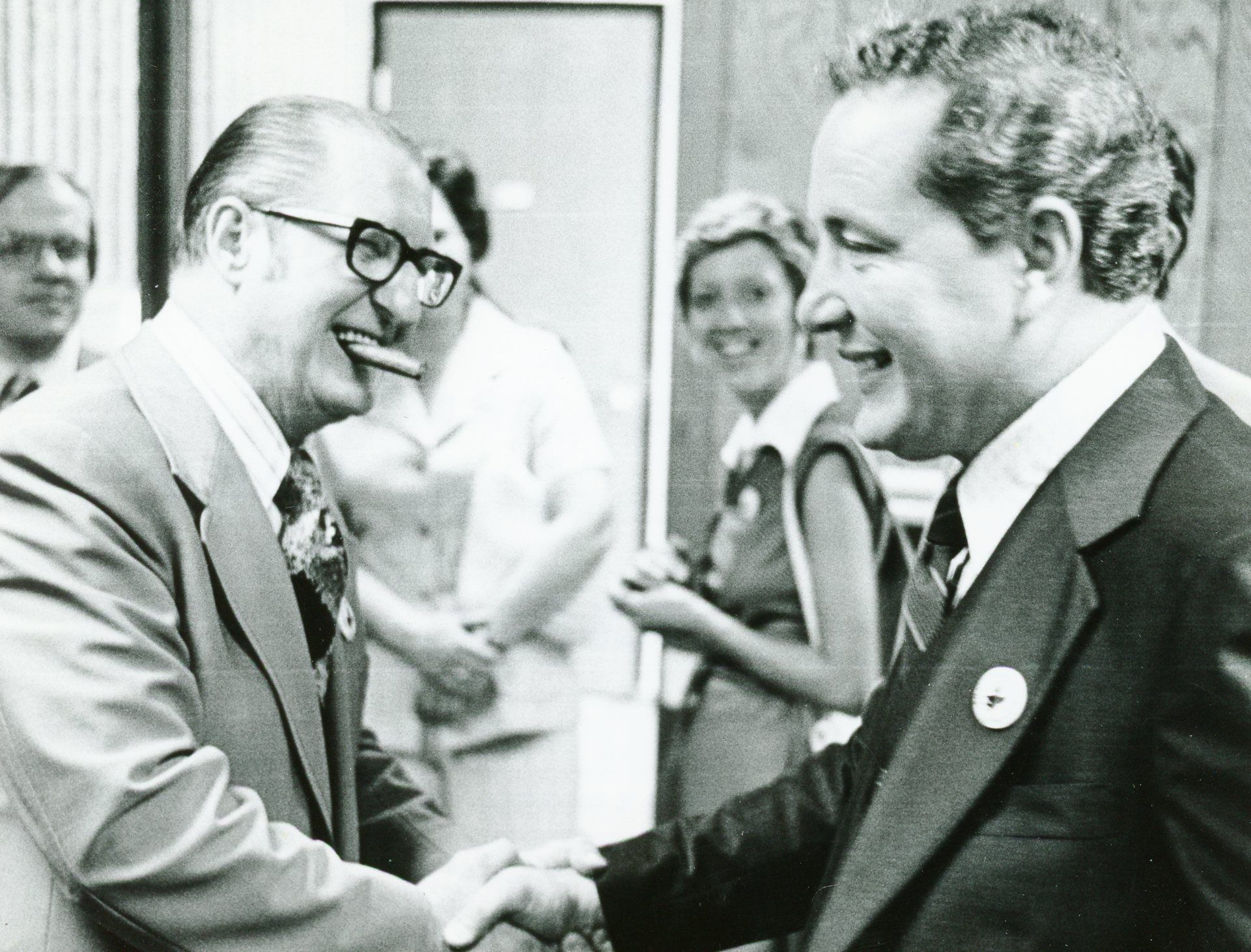 Wayne Police Officer Ray Le Cornu welcoming Allen Park Mayor Lada on May 15, 1977. They are at the Police Station. This photo was taken by Lothar E. Konietzko for the "Eagle".Cataloged By