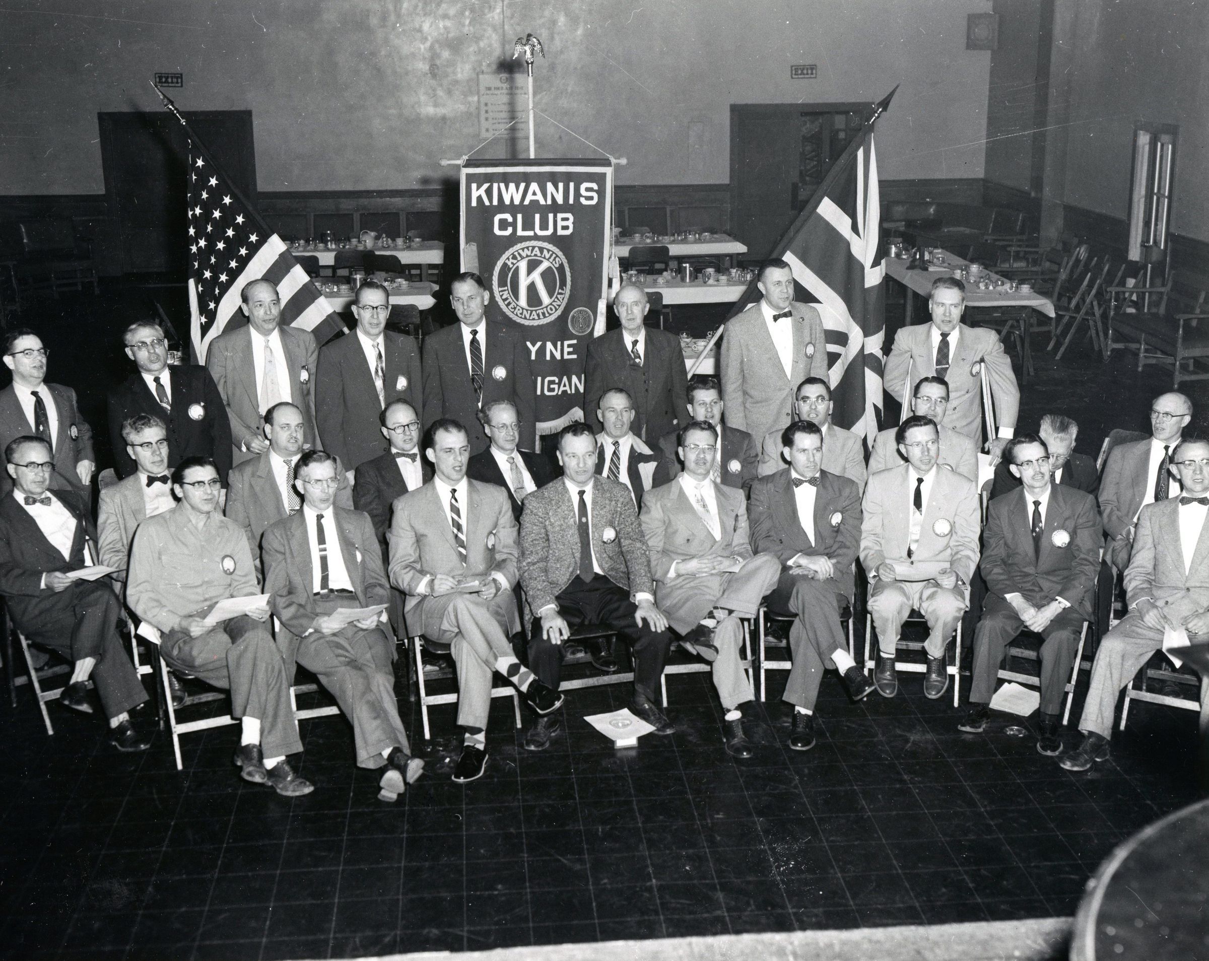 Kiwanis Group in Old Recreation Center auditorium. Front Row - UK, Jim Krebs, UK, Roy Meier, Bill Groves, UK, Ed Martin, Robert Bird, Al Tyrna. Middle Row - Floyd Neel, Henry Goudy, Clarence Woolf, Ed Brender, Ray Gray, Clinton Whitney, Ted Fourment, Ron Weston, Fern Watson, Frank Faurnier, P.D. Graham. Back Row - Harold Langworthy, Al Hill, UK, Dwight Glover, LeBaron, Clarence Ladd, Fred Allen, Robert Martin