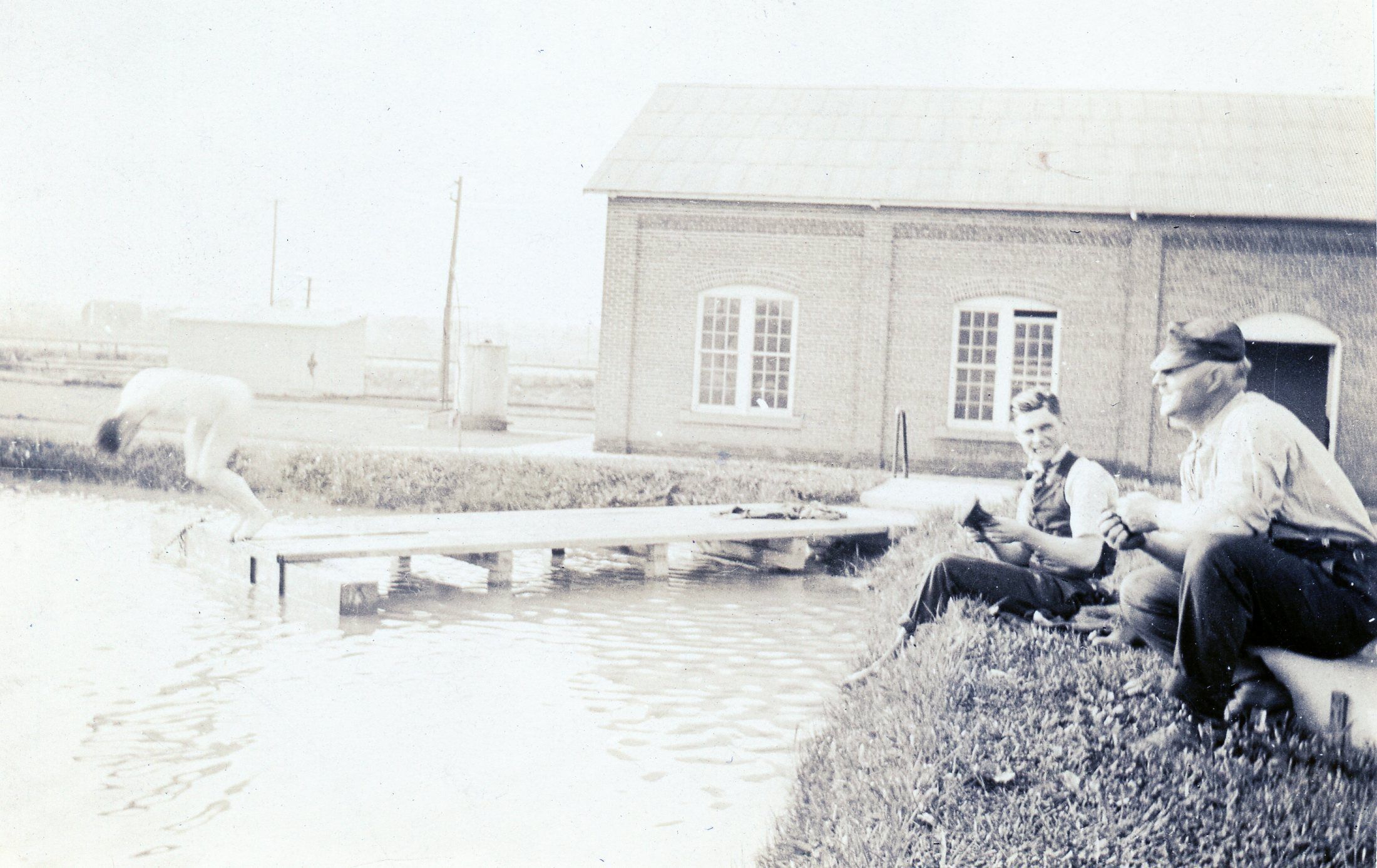 Workers using the artificial lake at the Imperial Oil Company Pipe Line Station. Address was 4400 Treadwell Rd. Wayne, MI 48184Cataloged By