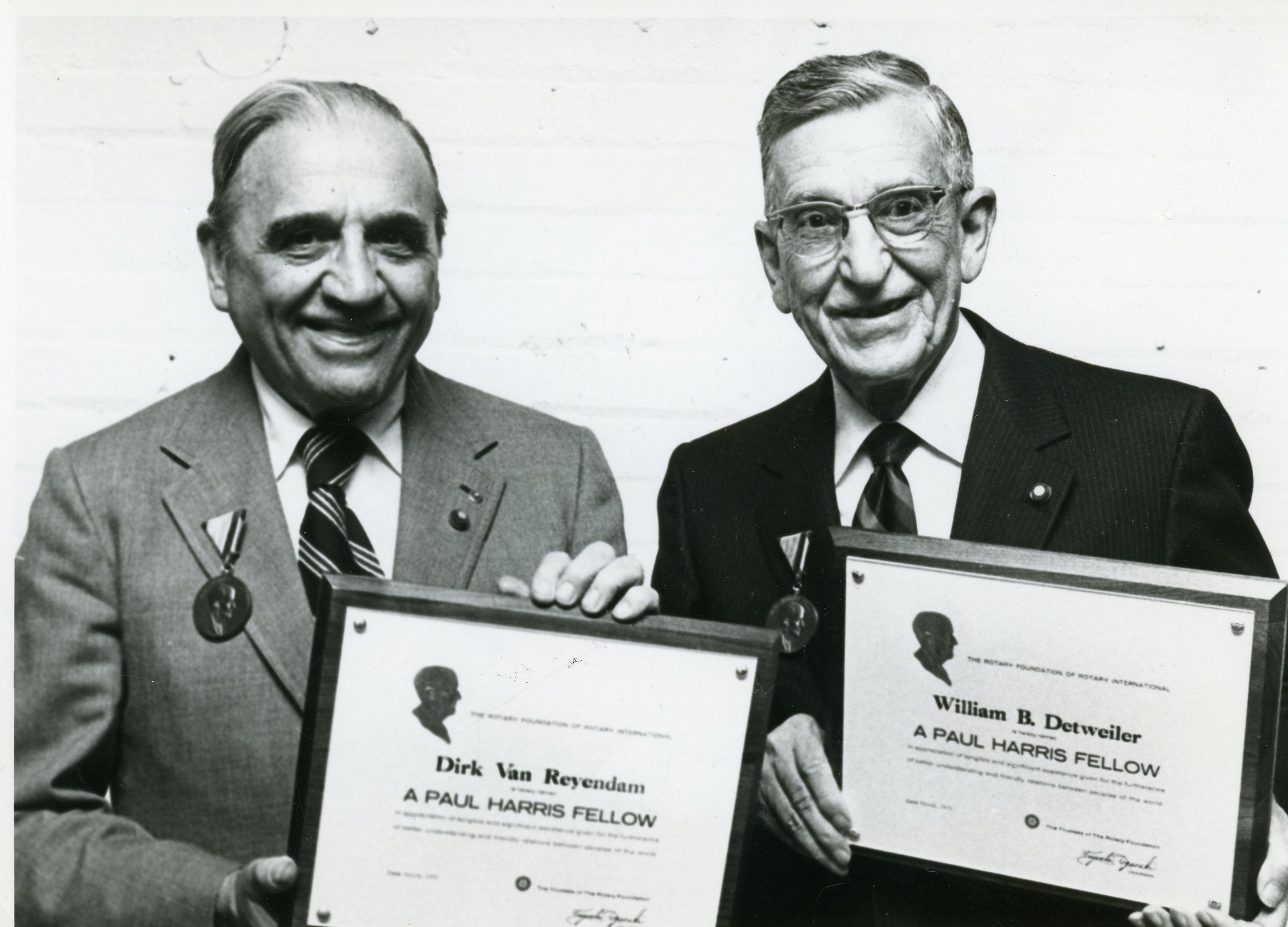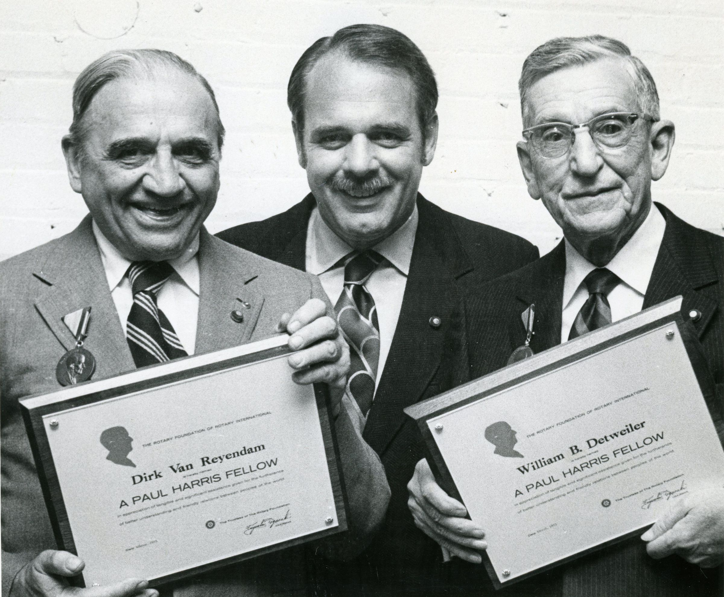 Dick Van Reyendam and William B. DetWeiler getting a Paul Harris Fellow Recognition by Bill Ives in 1973. Bill Ives is in the center. Photo taken by Lothar E. Konietzko.Cataloged By