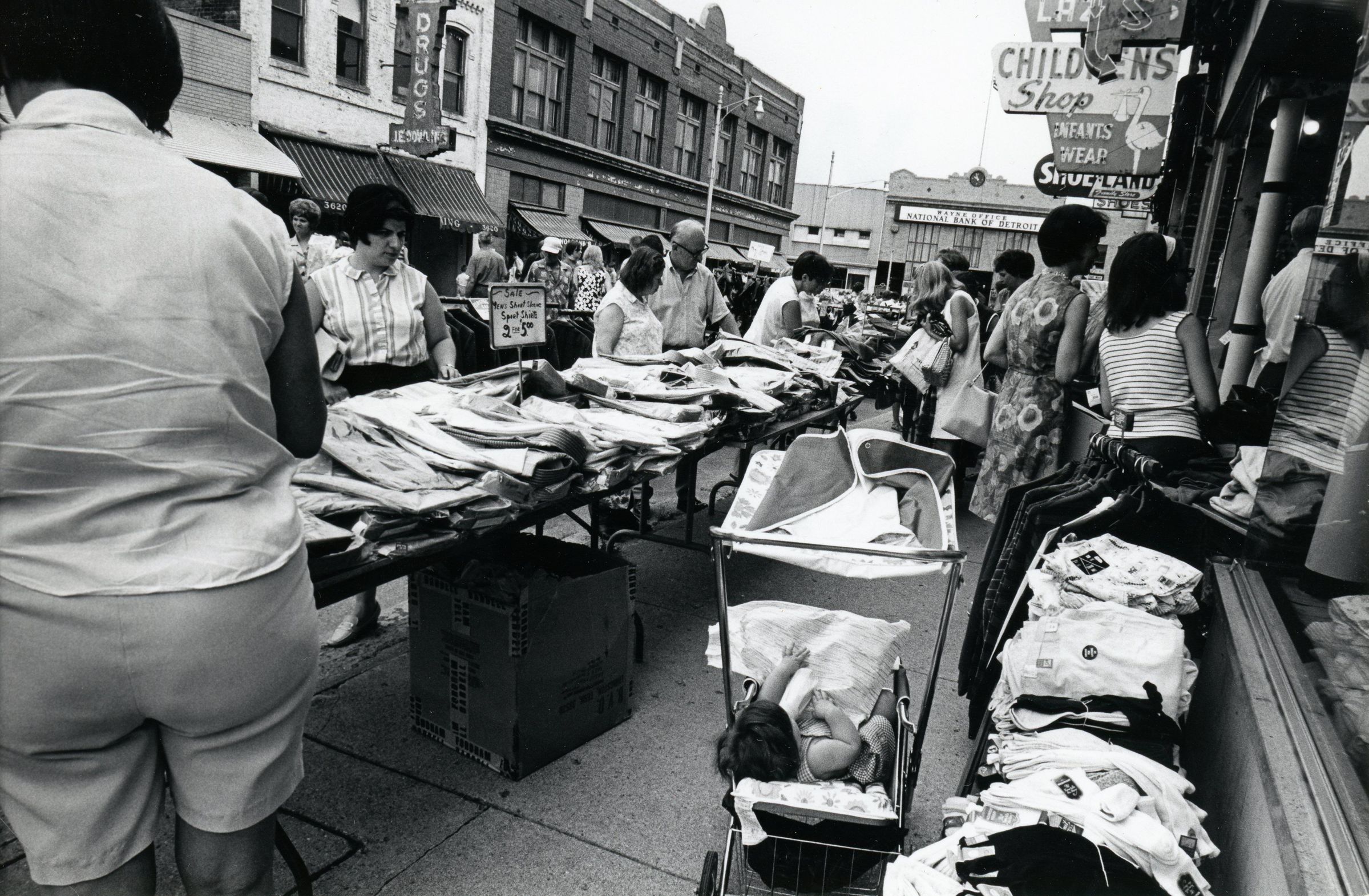 Sidewalk Sales Lazars. Monroe Street. August 1970. Rexall Drugs, Mulhollands, Hoops building in background.