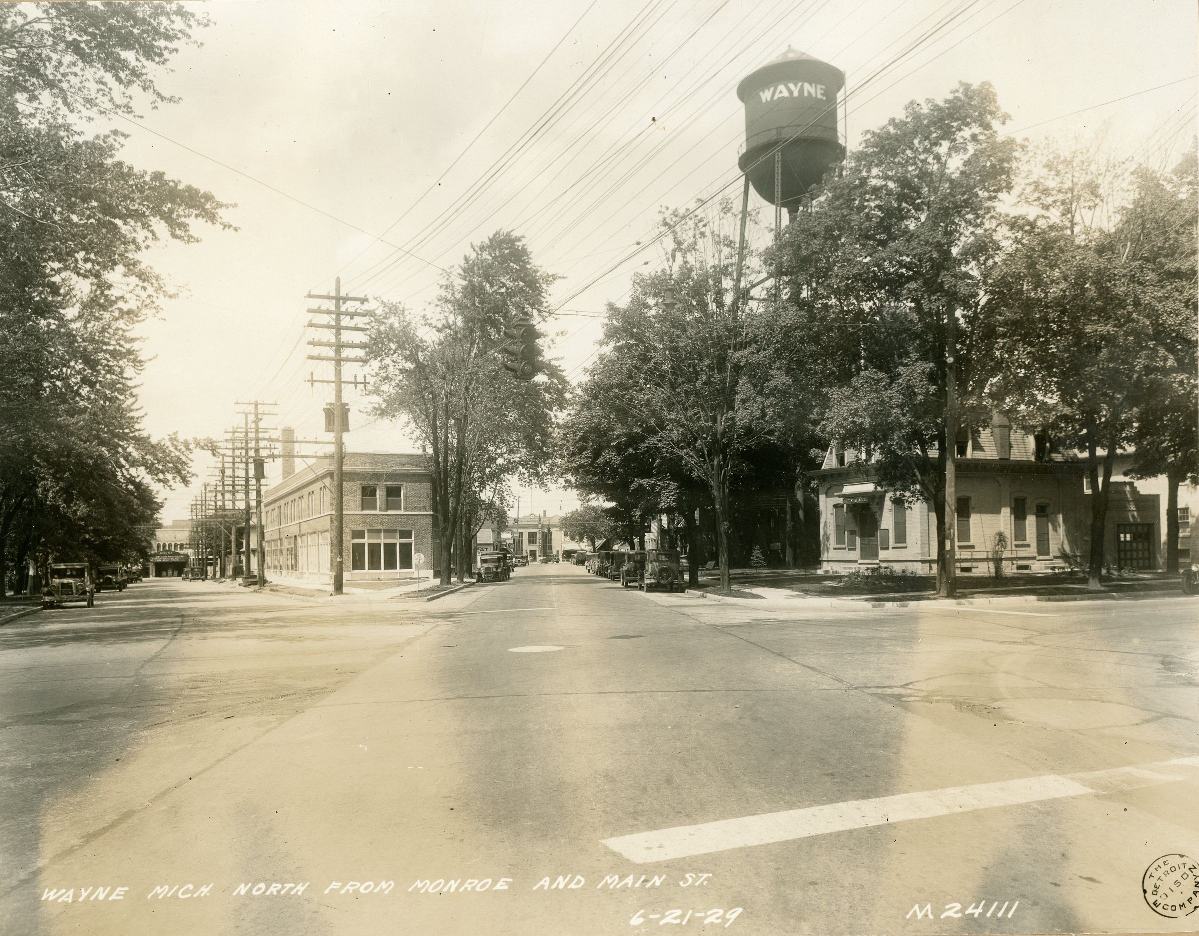 Looking North up Monroe and Biddle from Main. 1929. Village Hall at right, Water tower visible.