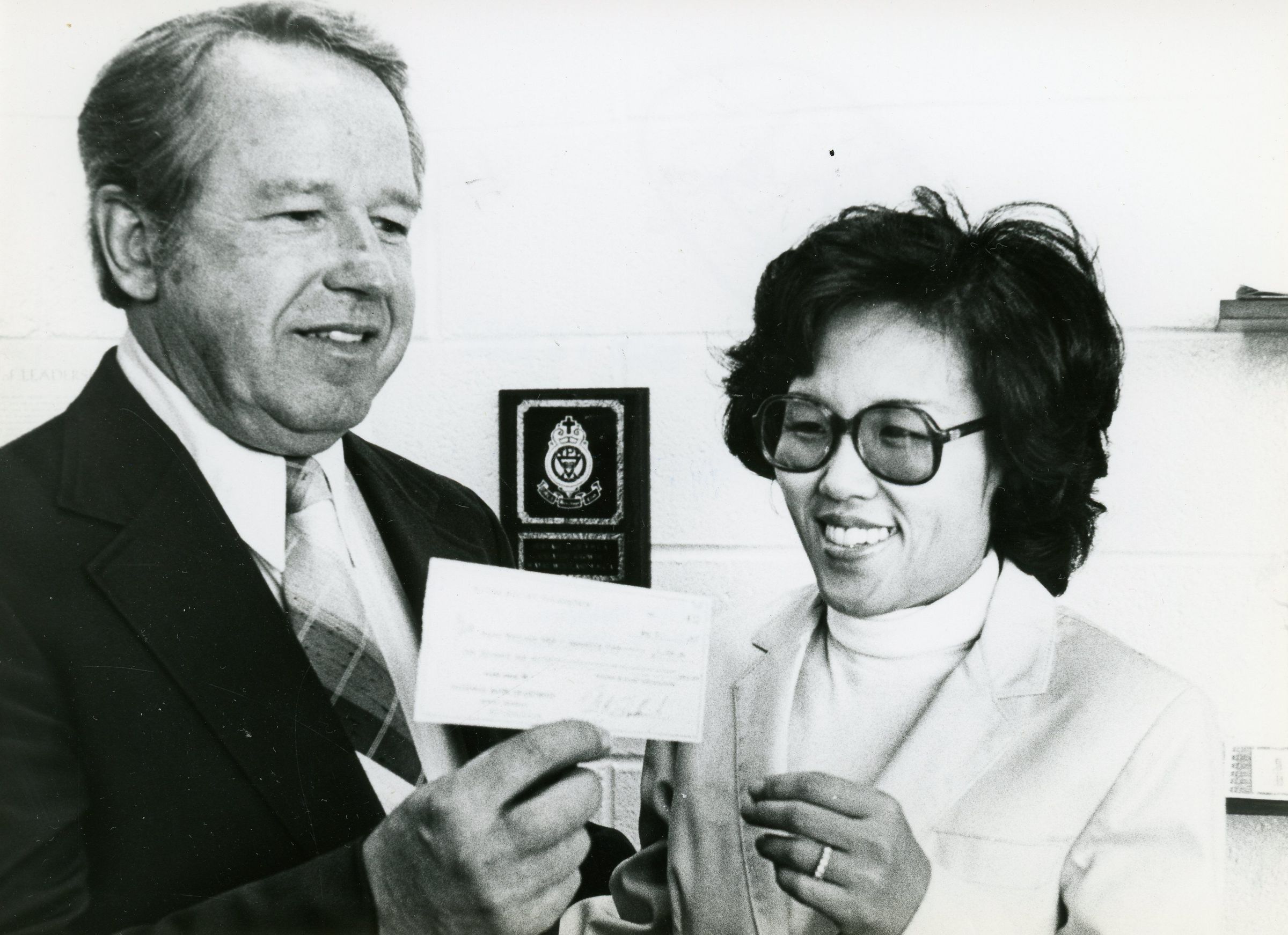 Rotary Club Member donating funds. Photo taken by Lothar E. Konietzko for the " Wayne Eagle' on May 12, 1982.