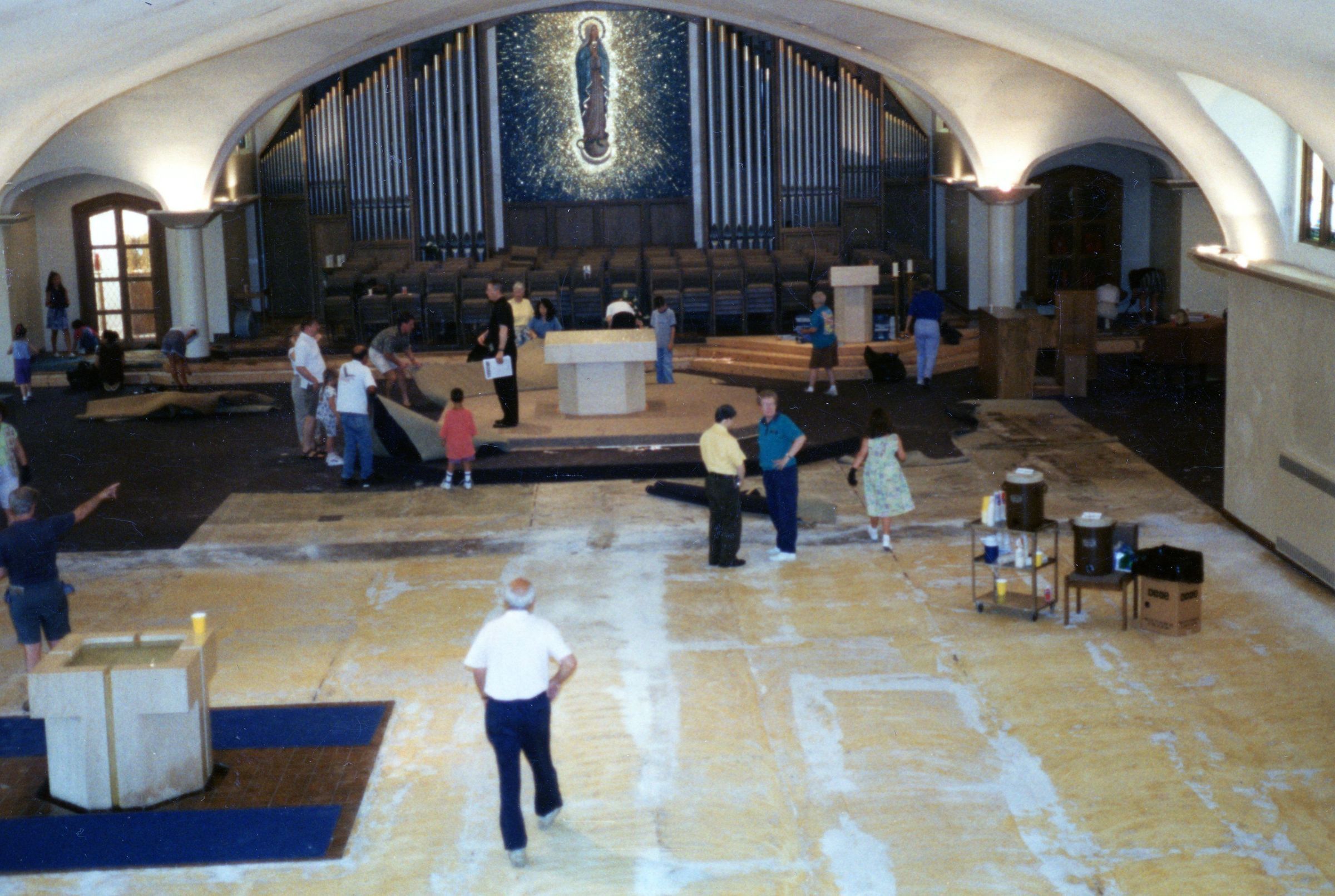 Replacing Sanctuary Carpet 6-27-1997. Altar, Organ and Mosaic visible