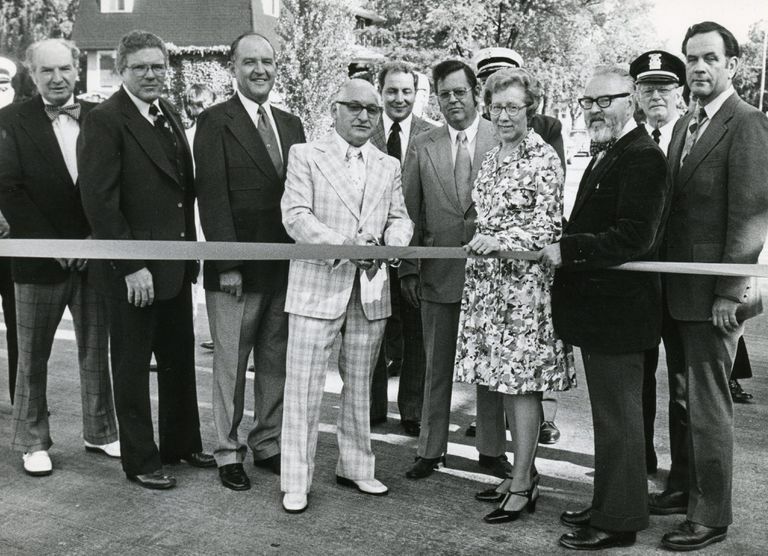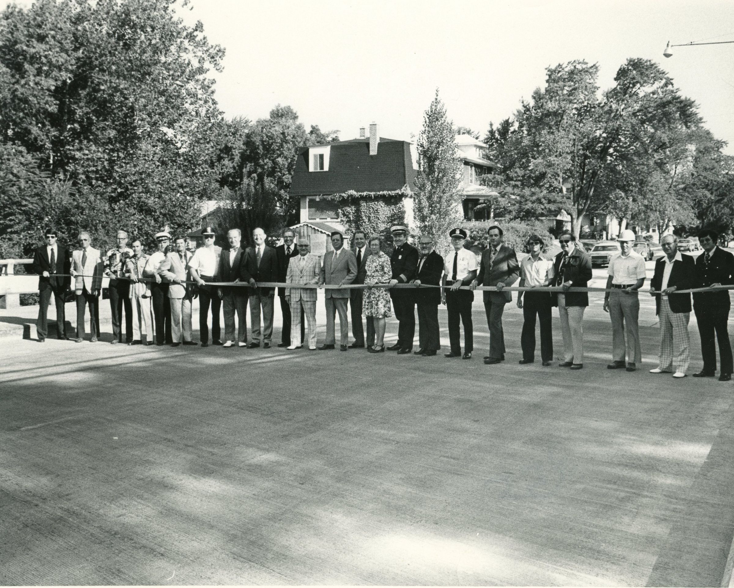Second Street Bridge Opening Ceremony September 8, 1976. Left to Right in center: Neil Prieskorn (Assistant Fire Chief), Kenneth O. McKee (State Representative), Dallas Keller (Superintendent of Public Works), Paul Lada (Mayor), Frank Simmons (Admin Assistant in Metro District OFC State Highways), Ray LeCornu (Director of Public Safety), Geneva Ford (City Clerk), Kenneth Warfield (Fire Chief), Edward E. Mahalak (State Rep), Herbert Haslam (Captain), Kurt M Heidmann (Councilman).Context