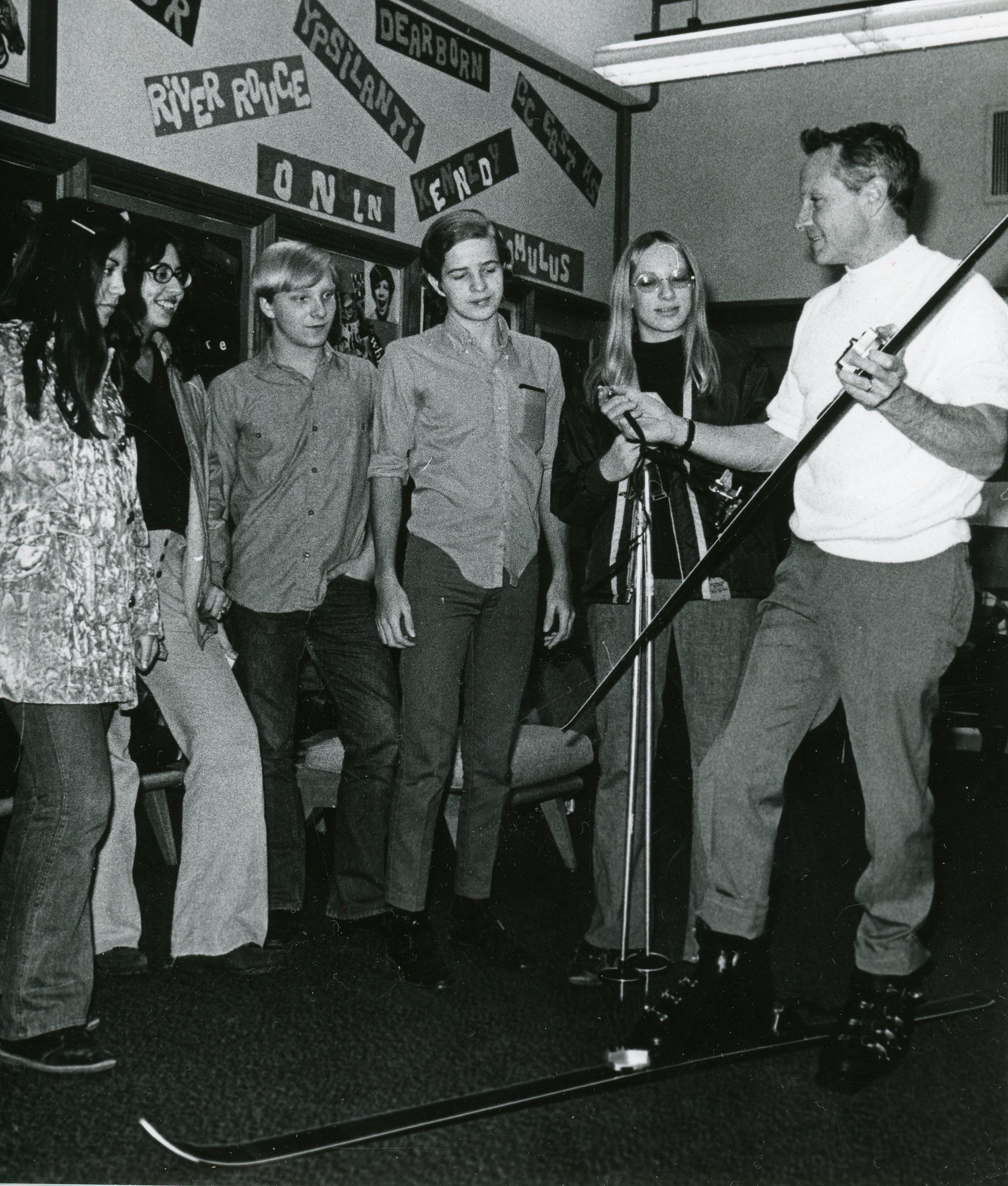 Wayne Memorial High School, Ski Demonstration December 1971, Carmen Segura on left, George Bell teacher