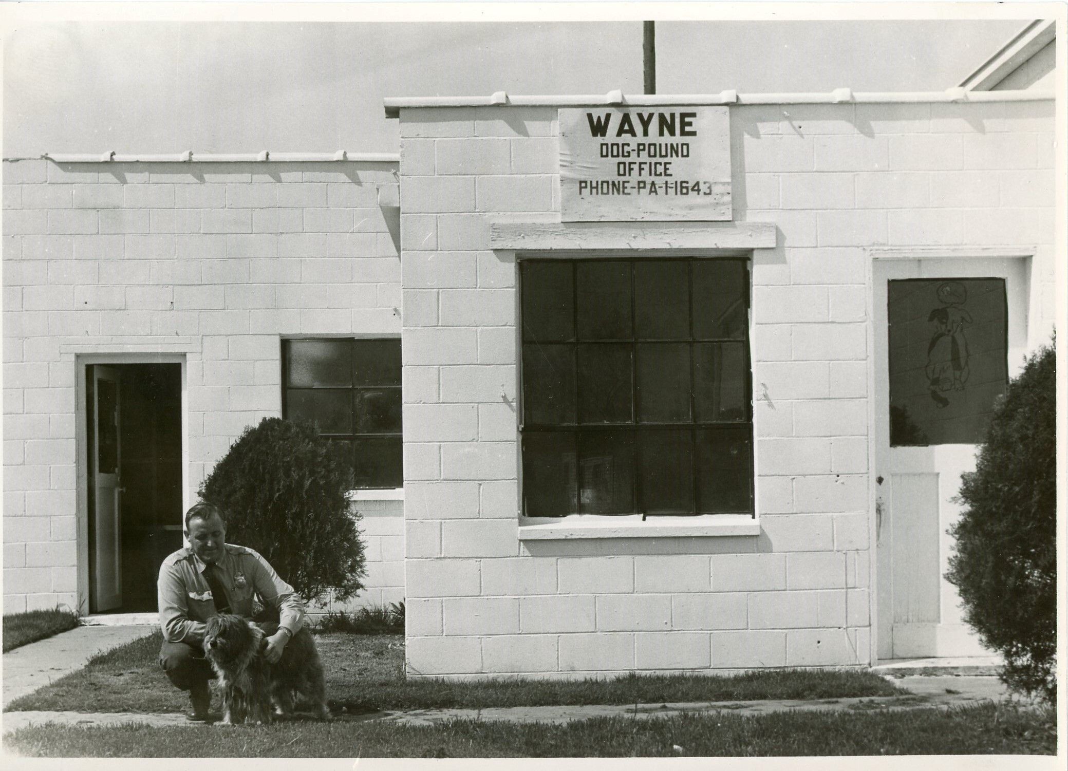 Officer holding a dog in front of the Wayne Dog Pound