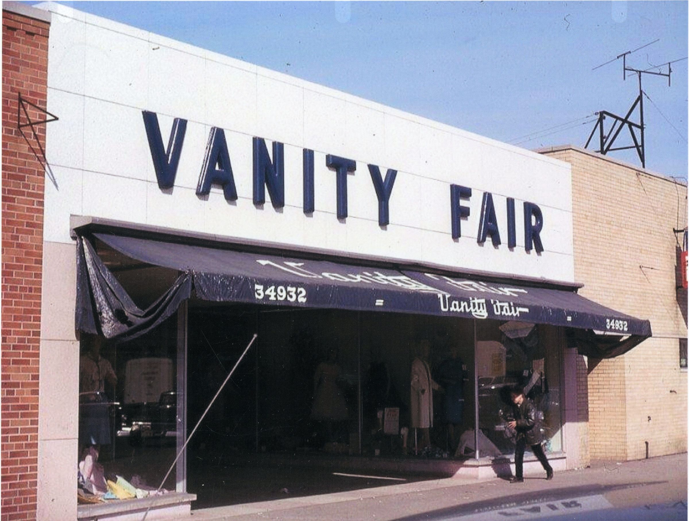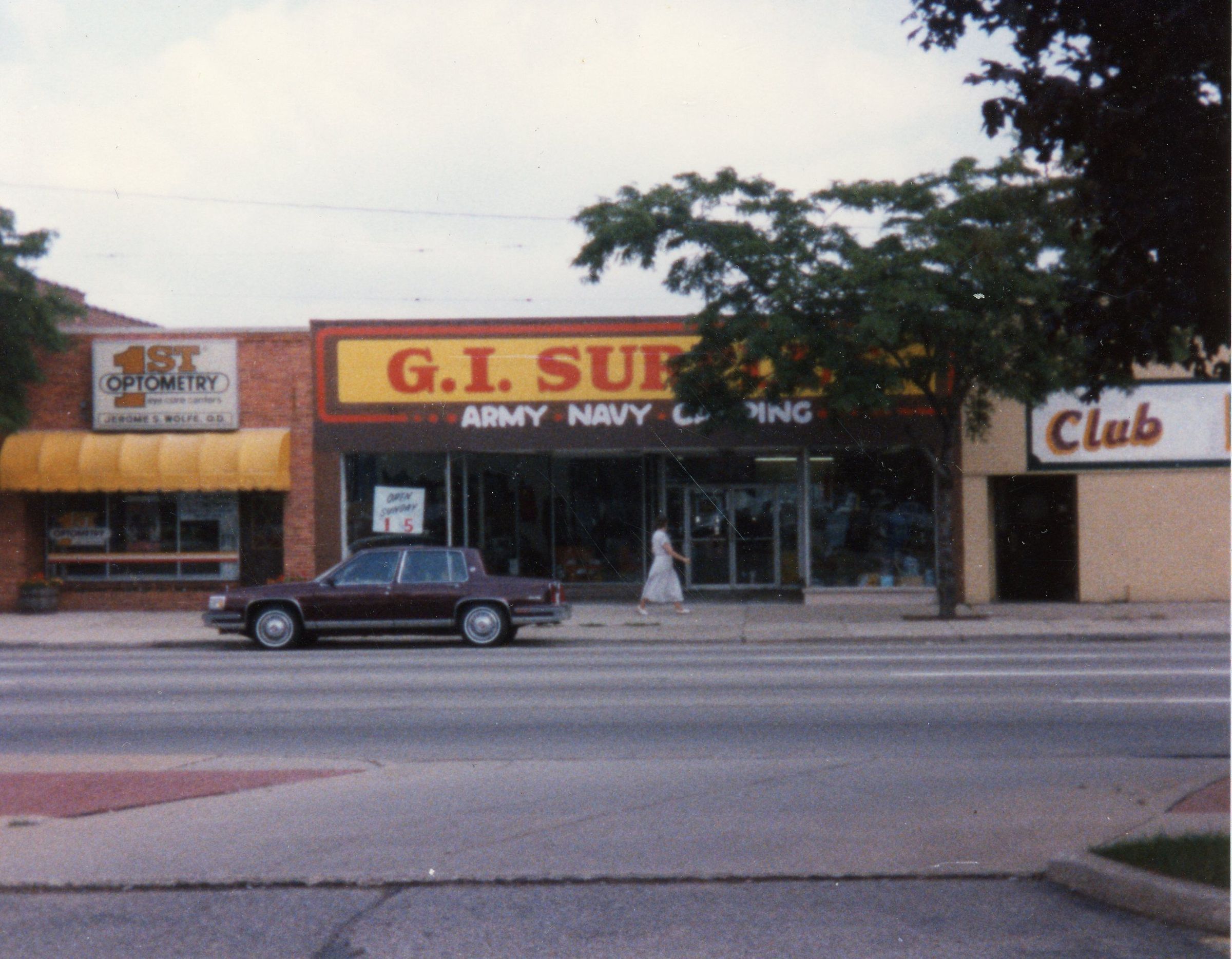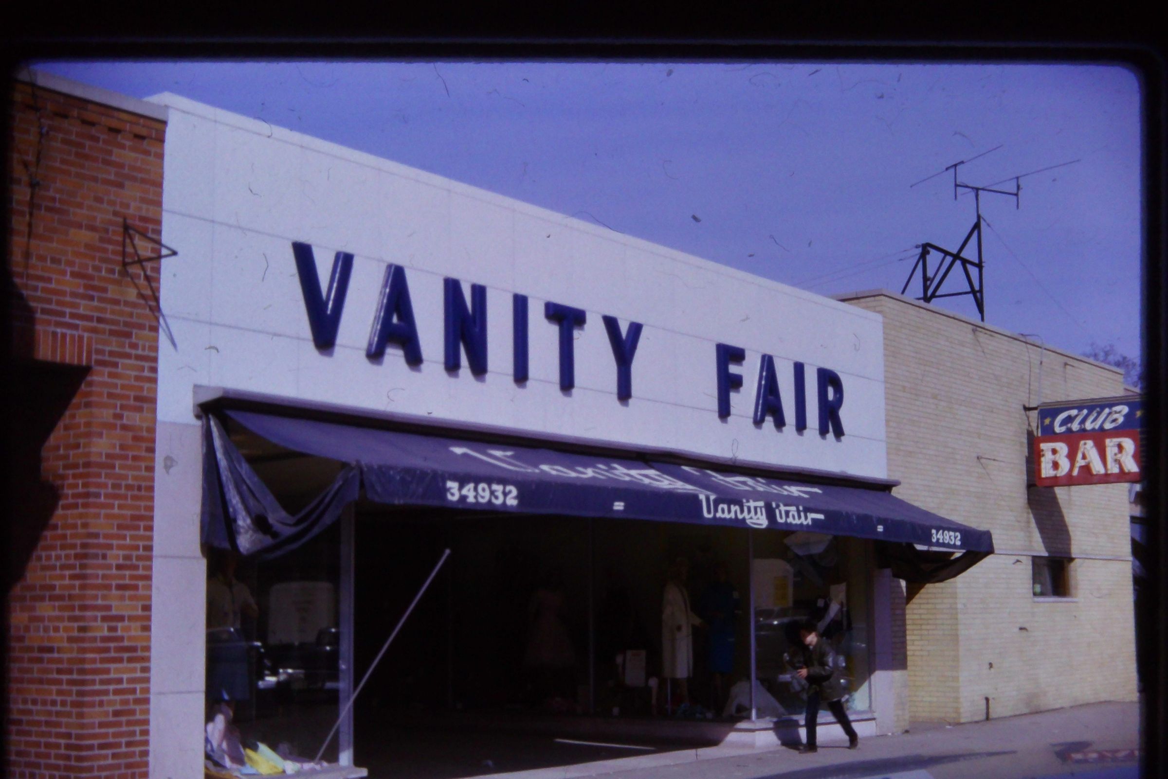 34932 Michigan - Vanity Fair - G.I. Army Surplus. 1st Optometry and Club Bar visible. Building still there as of 2024Cataloged By