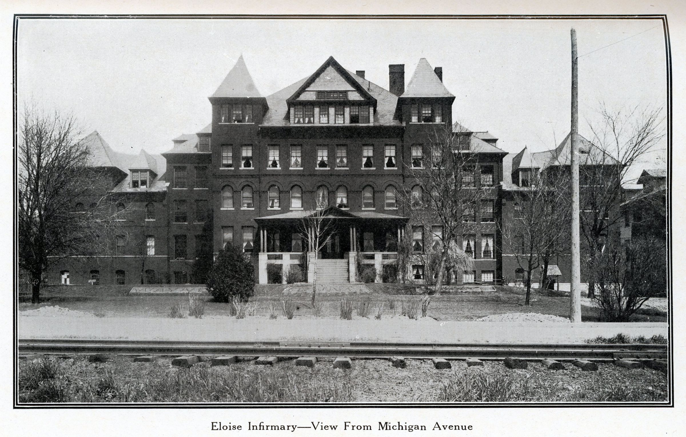 Infirmary View from Michigan Avenue, DUR streetcar tracks in foreground