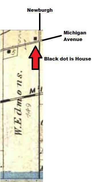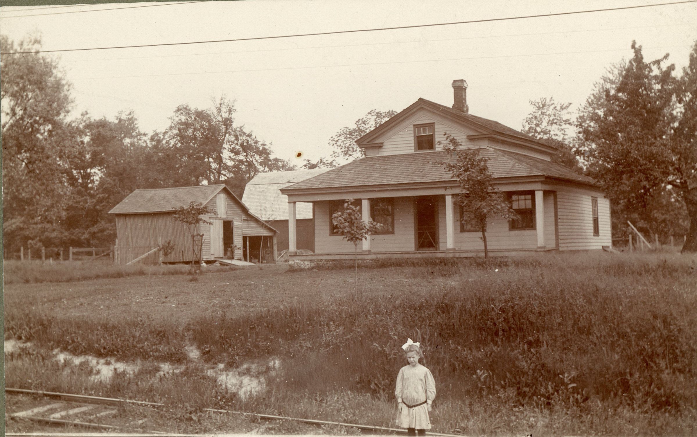 Willard Edwards Farmhouse, N.W. corner Michigan Avenue and Newburg. Frances Young Emerson pictured. DUR tracks visible