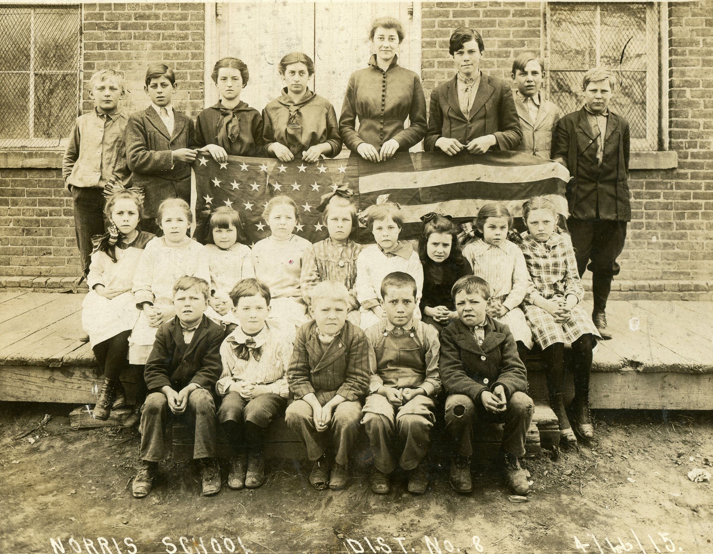 Norris School. c. 1915. Back Row: Walter Pitt, Charles Smith, Dorothy, Jay McPhee, Miss Anna Miller (Teacher), Earl Hiveley, George Hess, Conrad Prieskorn. Middle: Grace Avery, Marie Talkofski, Mildred, Emma, Marian Tucker, Doris Avery, Gertrude Hiveley, Ellen Ferguson, Marie Laskowski. Front: William Roach, Paul Curtis, Howard Avery, Joe Hiveley, Harold Avery. Melvin Raymo absent day picture was taken.Cataloged By