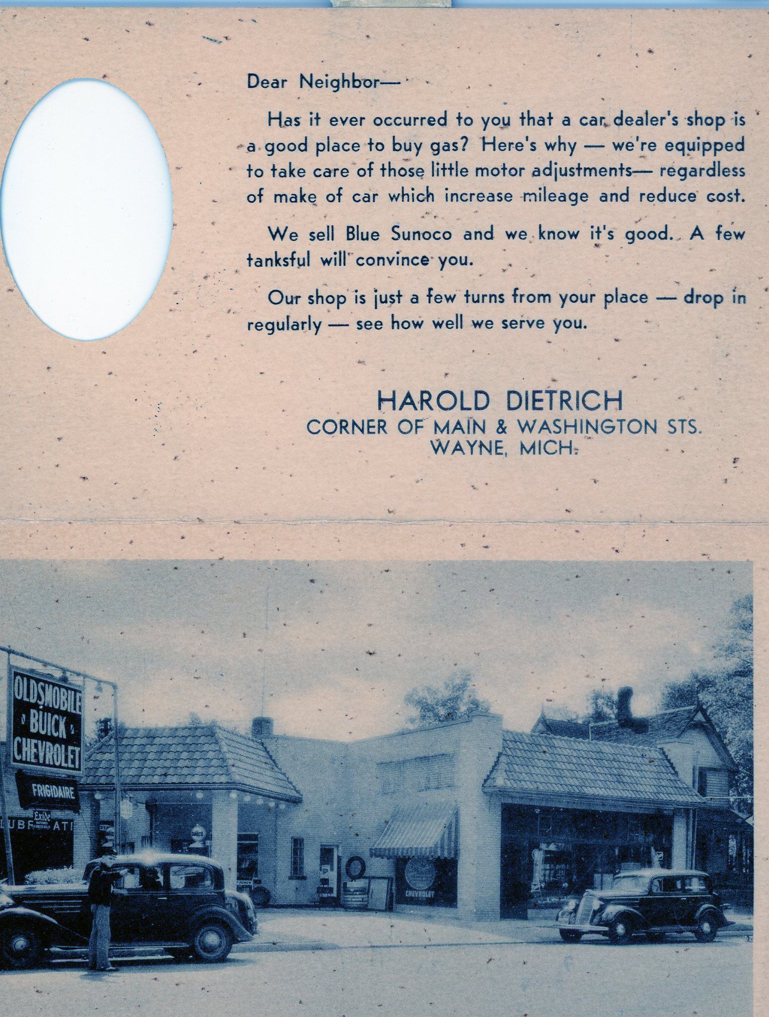 Harold Dietrich Auto Dealer and service station on SW corner of Main and Washington Street at 35109 Main St. Wayne, MI 48184. Sold Oldsmobile, Chevrolet and Buick.Cataloged By